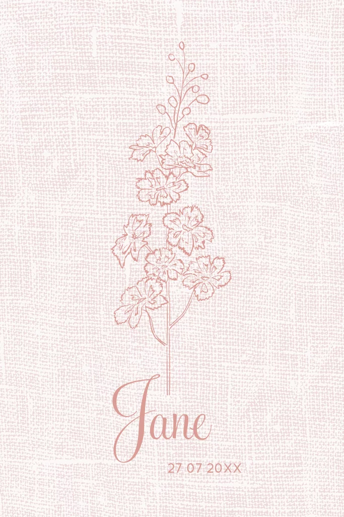 Lief geboortekaartje met een linnen-look achtergrond en een geboortebloem voor de maand juli, ridderspoor. Pas deze kaart met ronde hoeken naar eigen wens aan en zet de illustraties om naar foliedruk