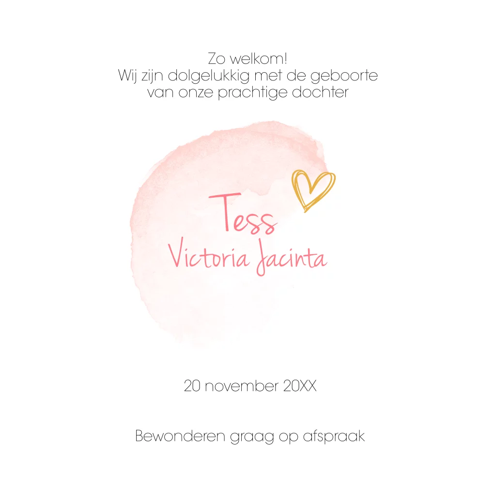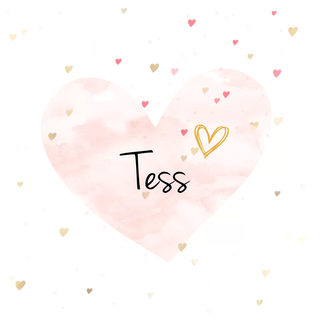 Lieve moderne geboortekaart met confetti van 'gouden' hartjes op witte achtergrond.