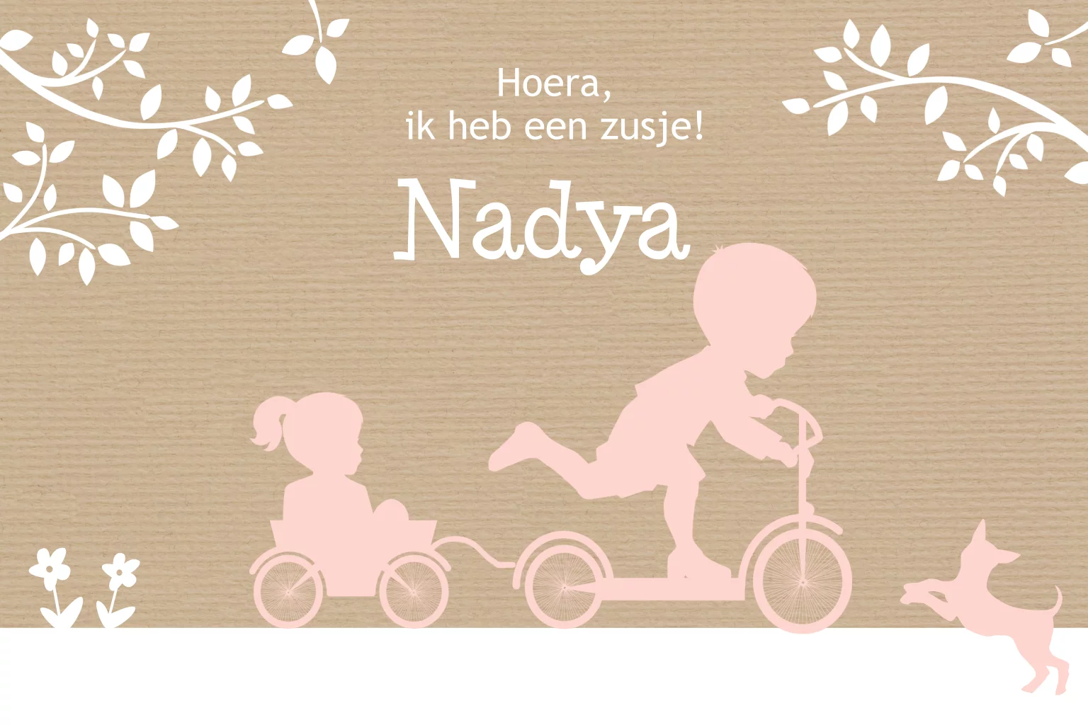 Lief liggend kaartje met silhouetten van 2 kinderen op kraftpapier. Jongetje op step met karretje waarin een zijn zusje zit.
