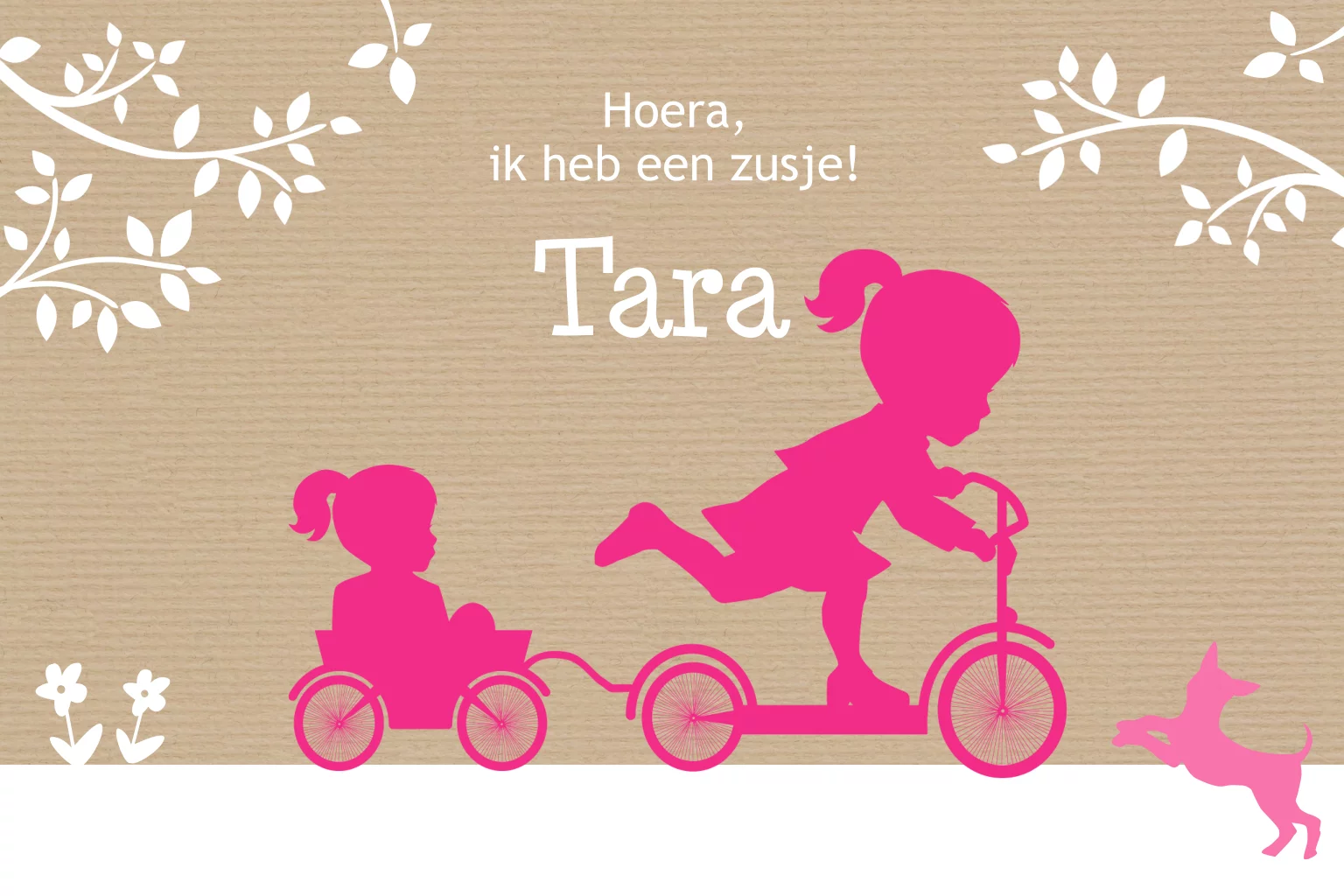 Lief liggend kaartje met silhouetten van 2 kinderen op kraftpapier. Meisje op step met karretje waarin een zijn zusje zit.