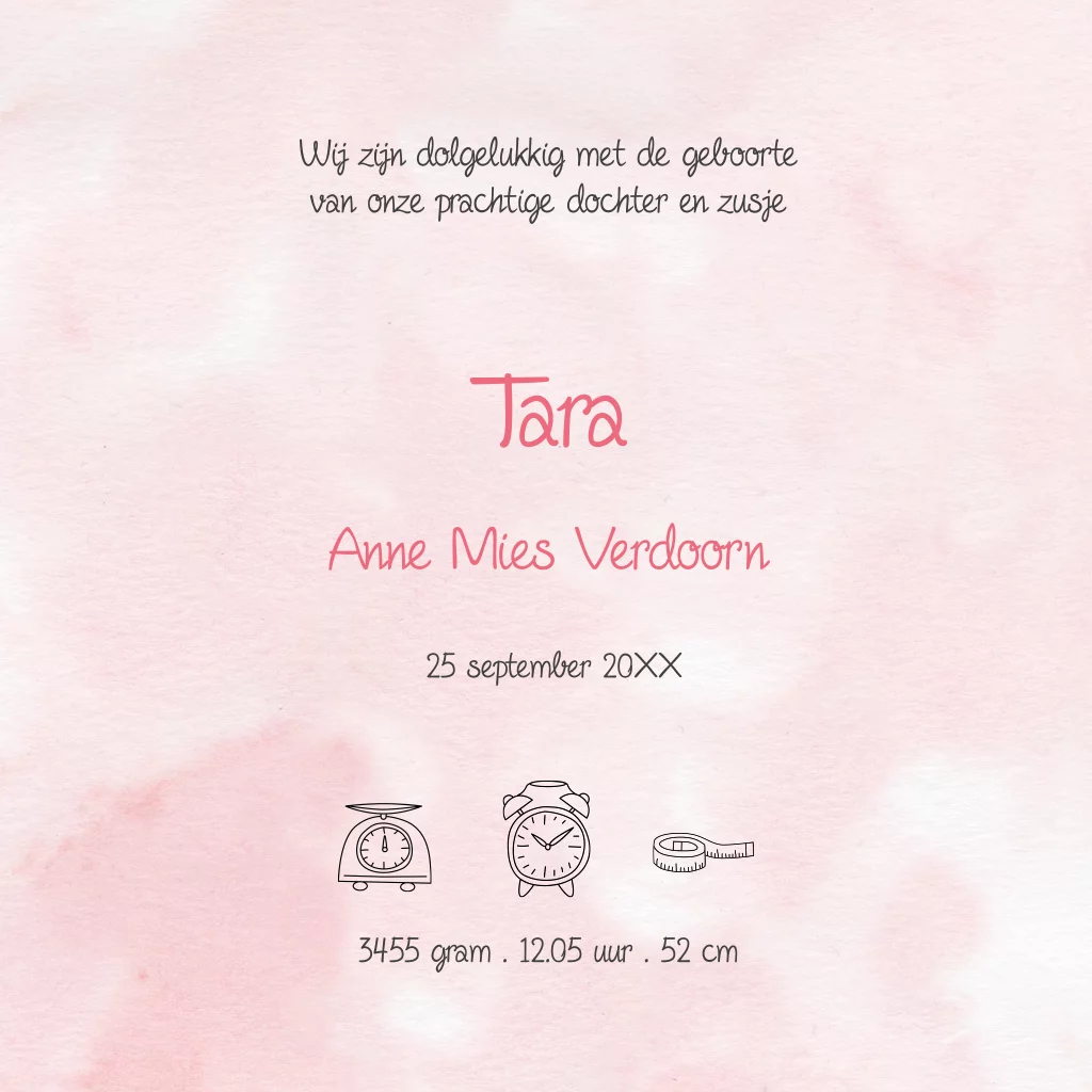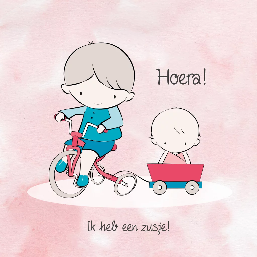 Mooie geboortekaart voor meisje met broertje op driewieler met lief zusje achterop. Een proefdrukje voor maar €1,00