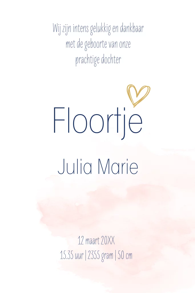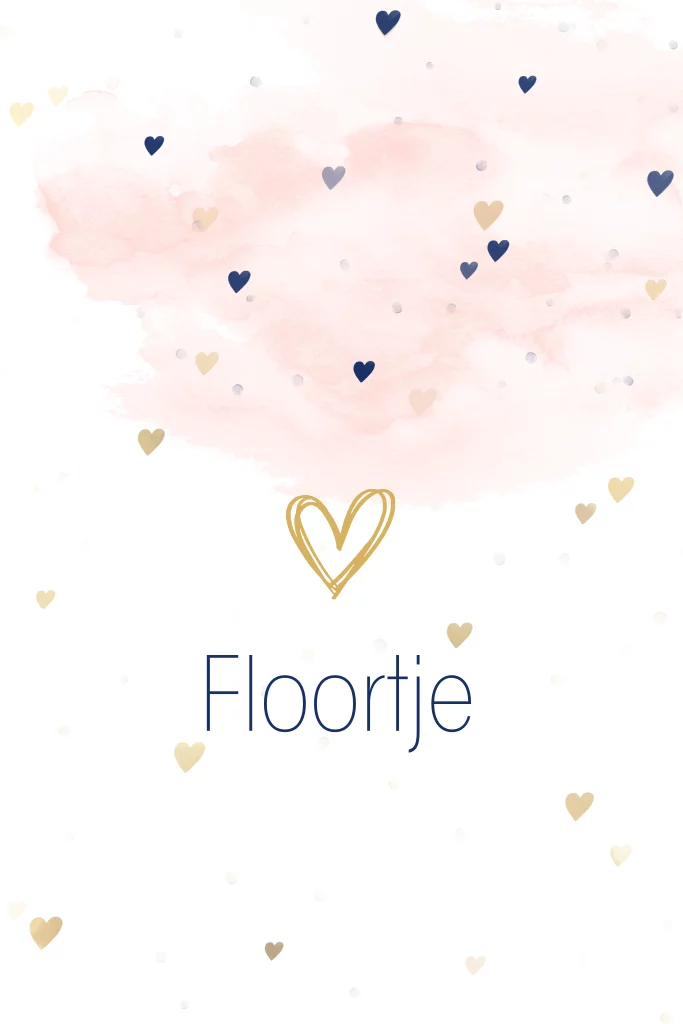 Trendy geboortekaart met dwarrelende goudkleurige hartjes en waterverf vlek. De kleuren kunnen worden aangepast.