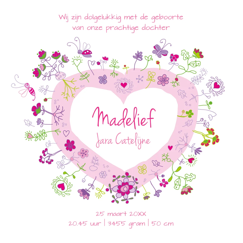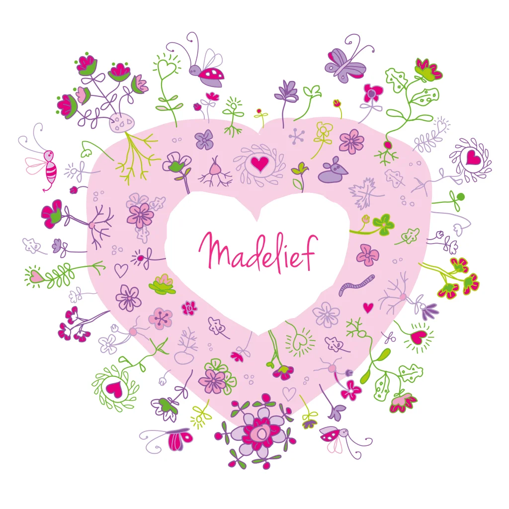 Origineel geboortekaartje voor lief meisje met wereldbol in de vorm van een hart, begroeit met planten en getekende bloemetjes. Mooi geboortekaartje Madelief met schattige dieren, een lieveheersbeestje, bijtje en vlindertjes.
