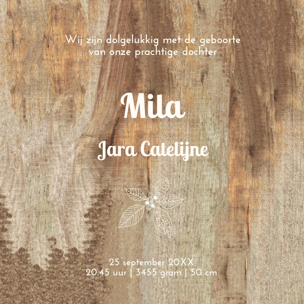 Origineel geboortekaartje Mila voor lief meisje met uiltje op tak met getekende blaadjes. Mooi en hip geboortekaartje om zelf te maken. Lieve getekende uil op tak en houten achtergrond.