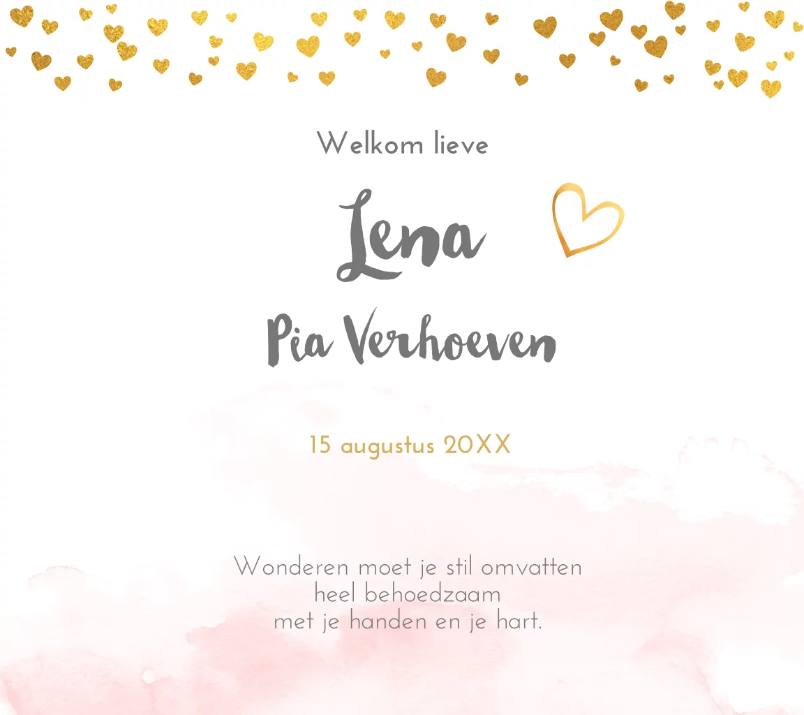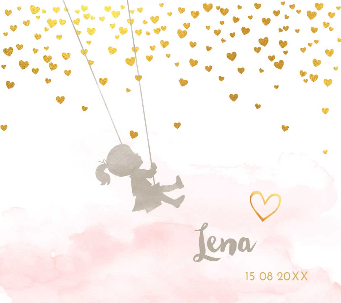 Mooie geboortekaart met goudkleurige hartjes regen en waterverf silhouetten voor een meisje