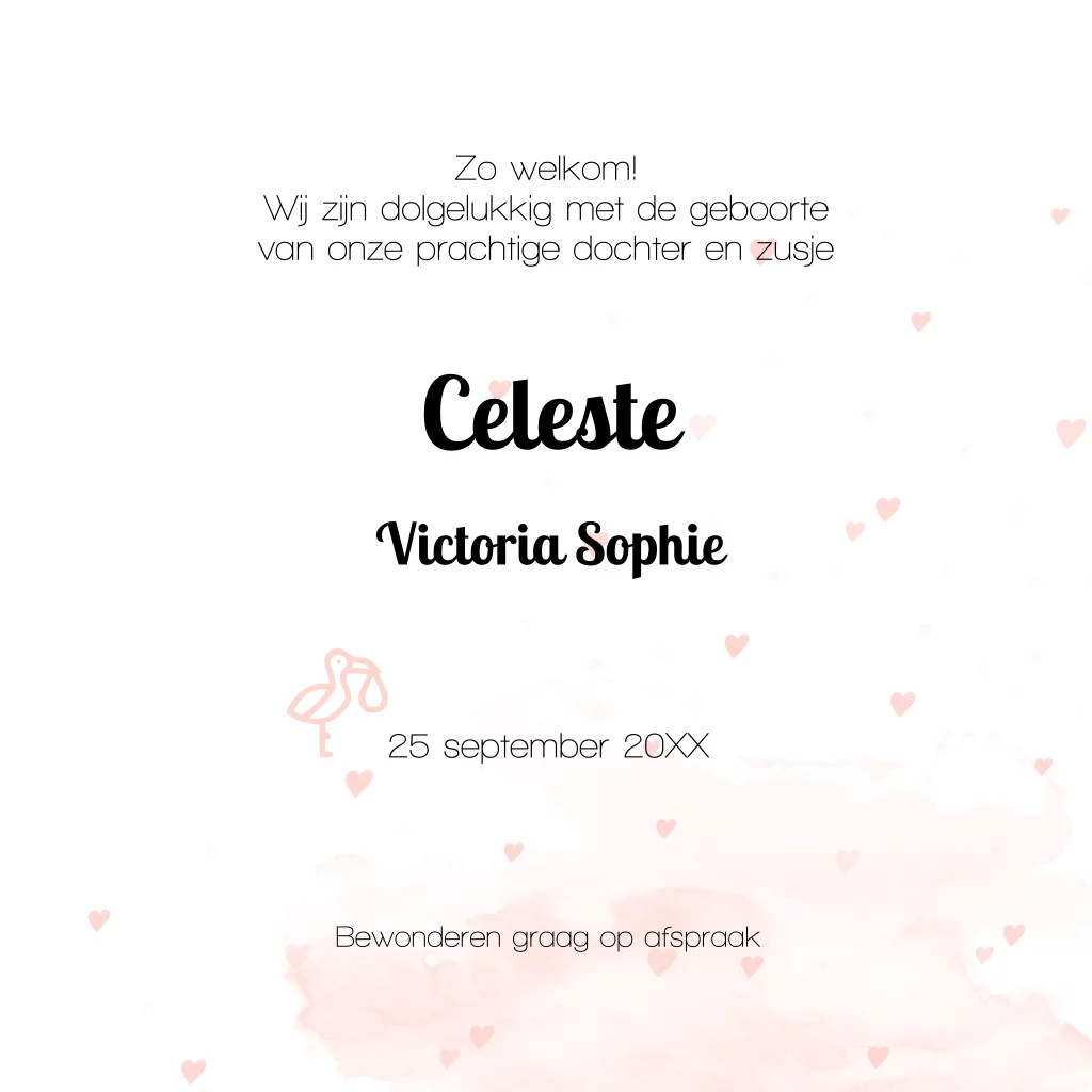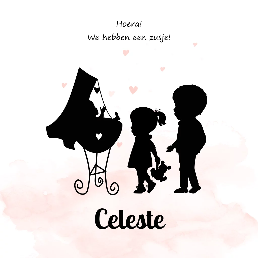 Lieve geboortekaart met wieg en broertje en zusje voor derde kindje en confetti van hartjes op witte achtergrond met aquarel.