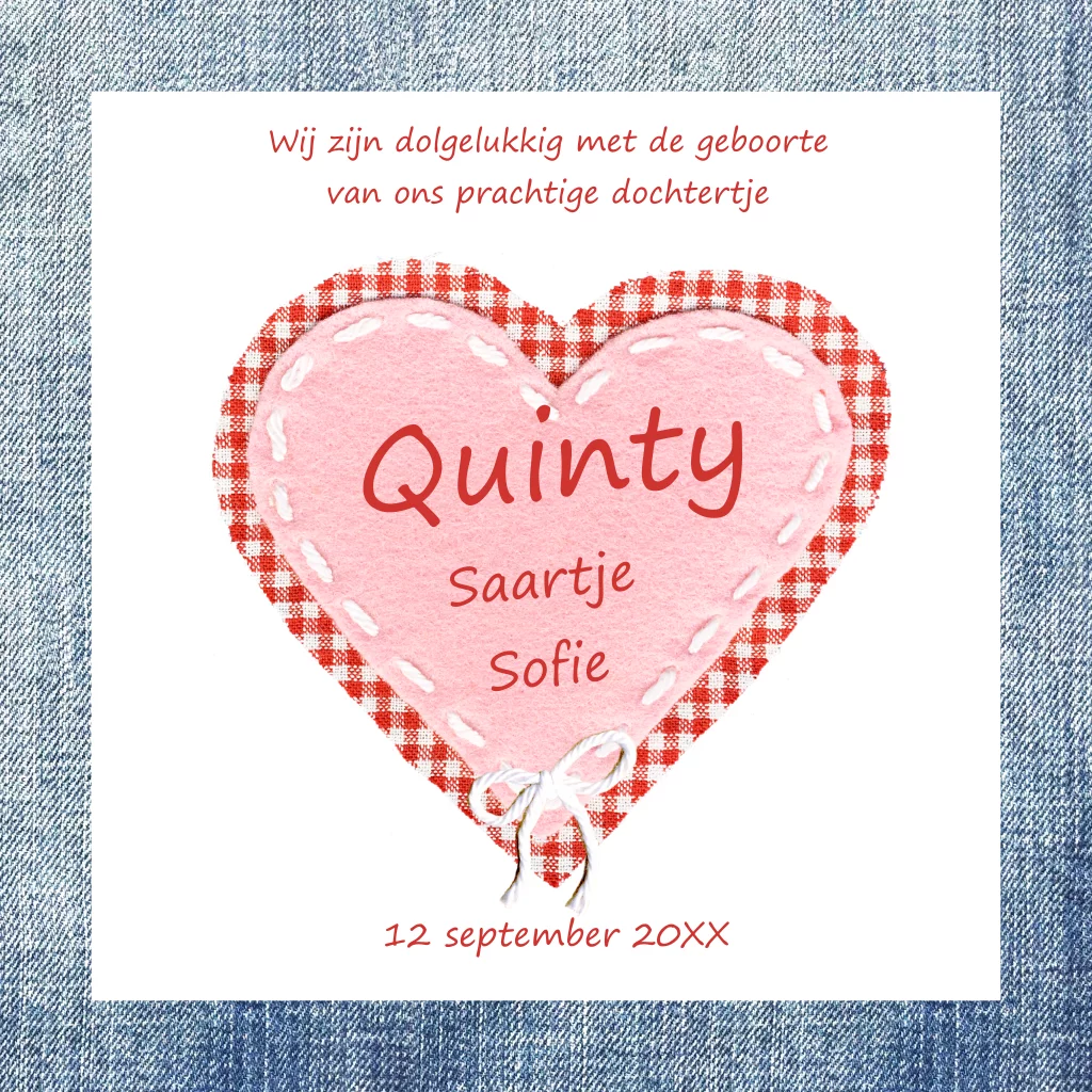 Hippe spijkerstof geboortekaart Quinty met leuke ruiten hartjes