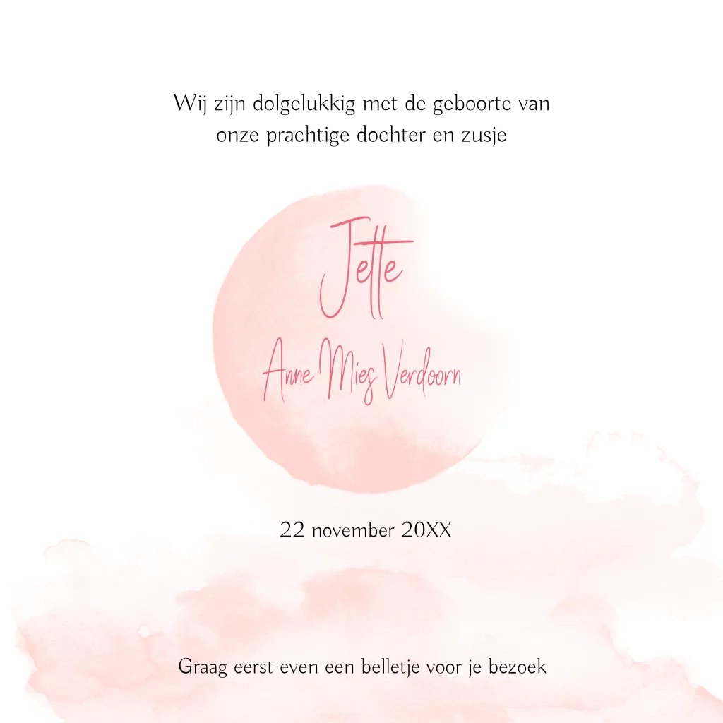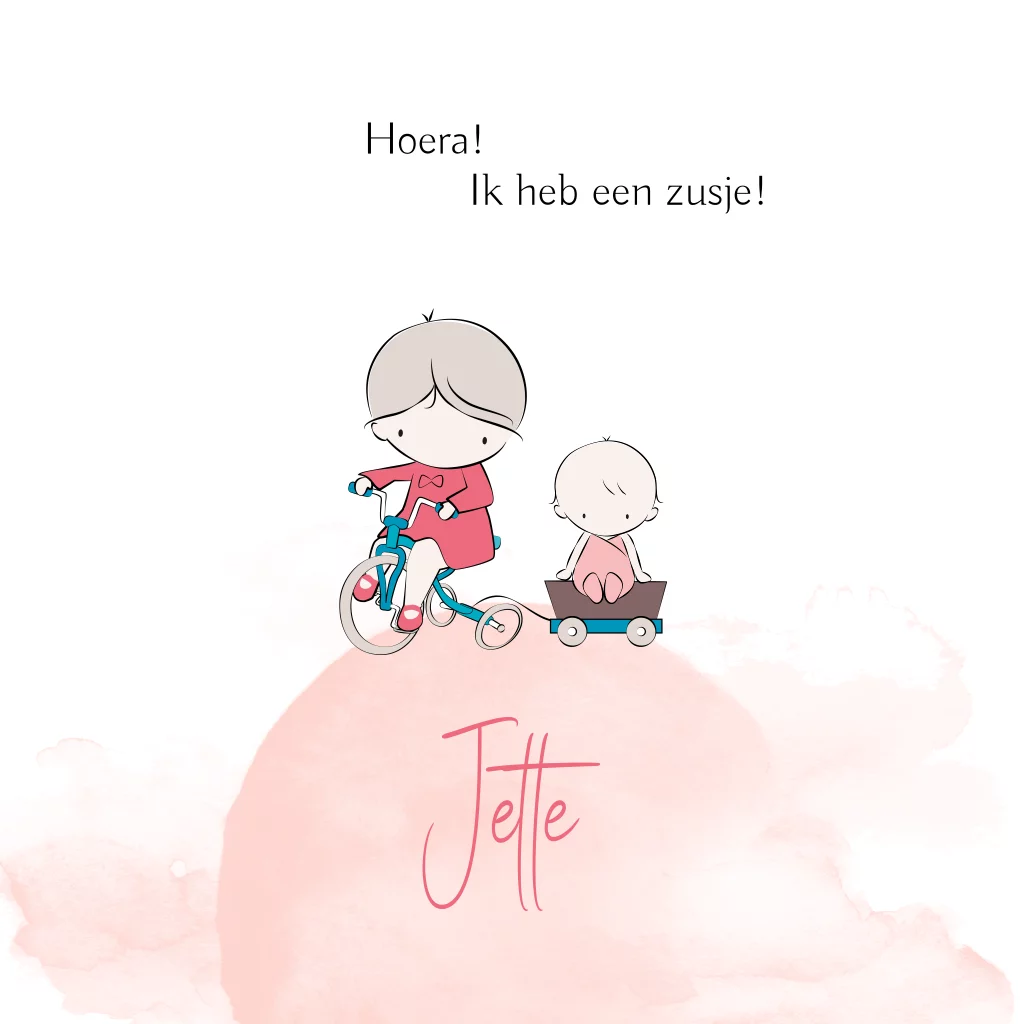 Mooie waterverf geboortekaart met een illustratie van een meisje op driewieler met haar kleine zusje op wereldbol.