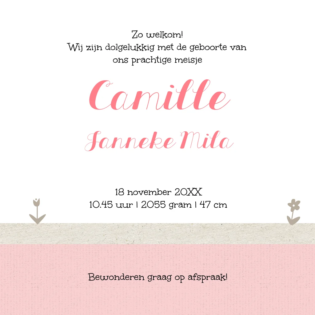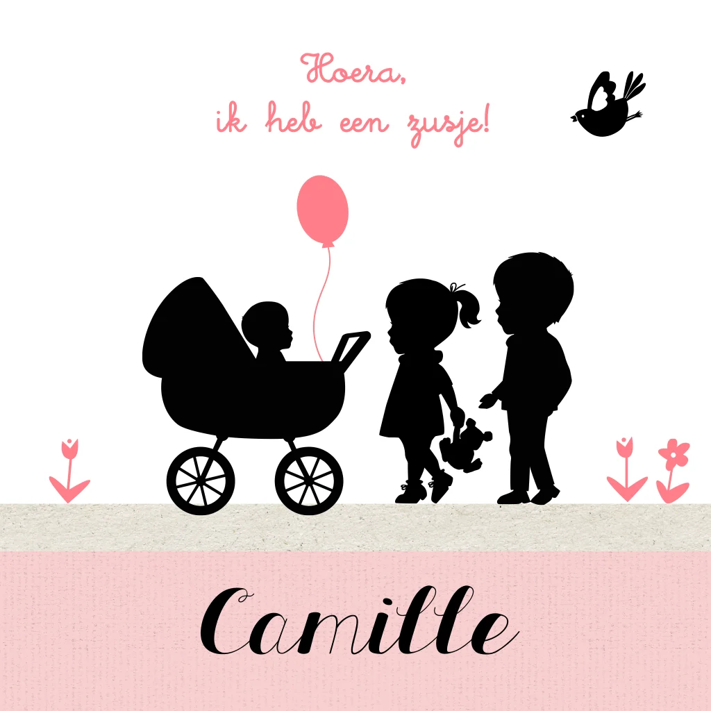 Lief en stijlvol geboortekaartje voor meisje met kinderwagen en silhouet van grote broer en zus.