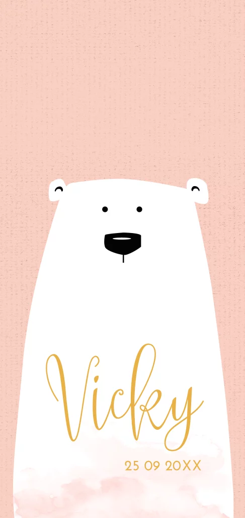 Hip staand geboortekaartje met een beertje en een knalroze achtergrond. Deze kaart kun je zelf aanpassen