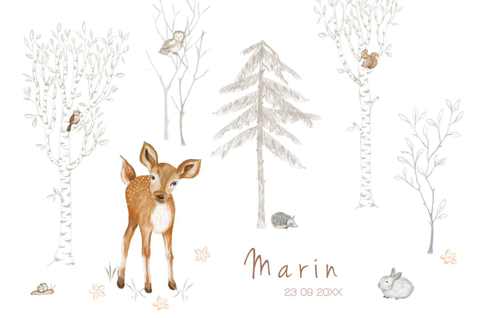 Geboortekaartje met getekende illustraties van bomen en bosdieren. Een lief hertje, vogeltje, uiltje, eekhoorn en een konijntje tussen de bomen. Passend bij een babykamer met getekende bosdieren.