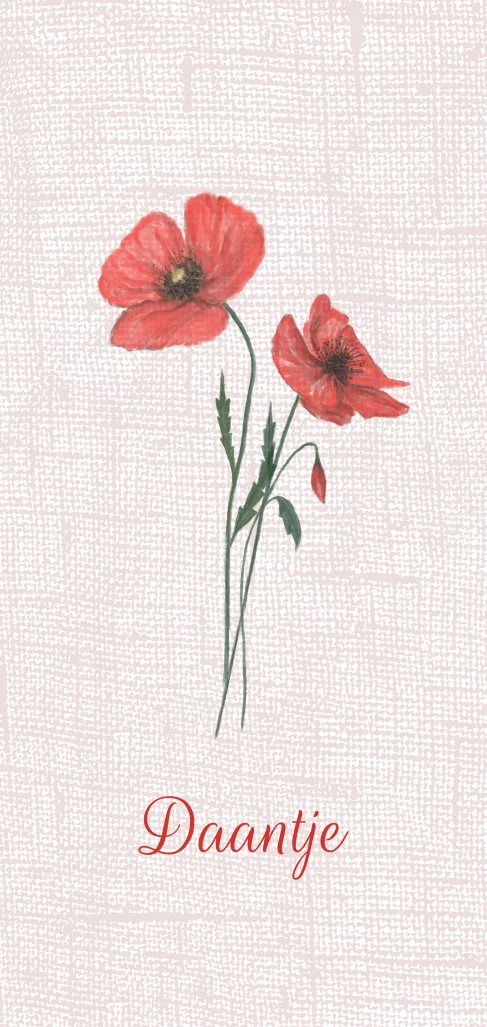 Een stijlvolle geboortekaart met een linnen look achtergrond en een klaproos oftewel poppy voor de maand augustus. Pas eenvoudig de kleur van de linnen achtergrond aan. Wil je liever een ander formaat, laat het ons weten, wij passen dit gratis voor jullie aan!