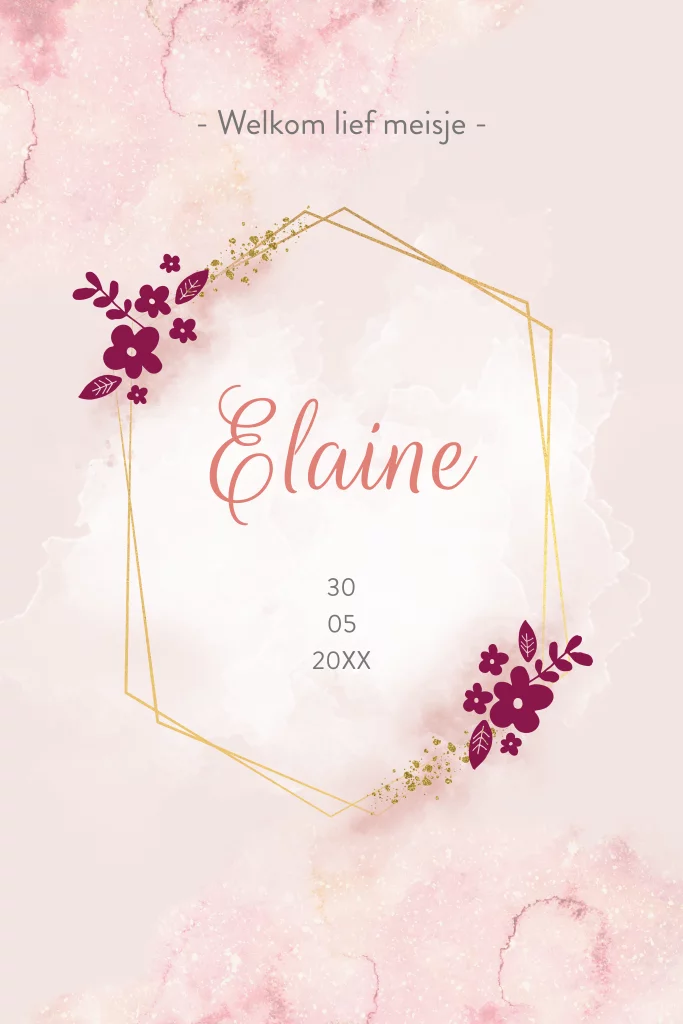 Schattig geboortekaartje met bloemetjes en waterverf en afgeronde hoeken. Pas zelf de teksten aan om de kaart helemaal eigen te maken.