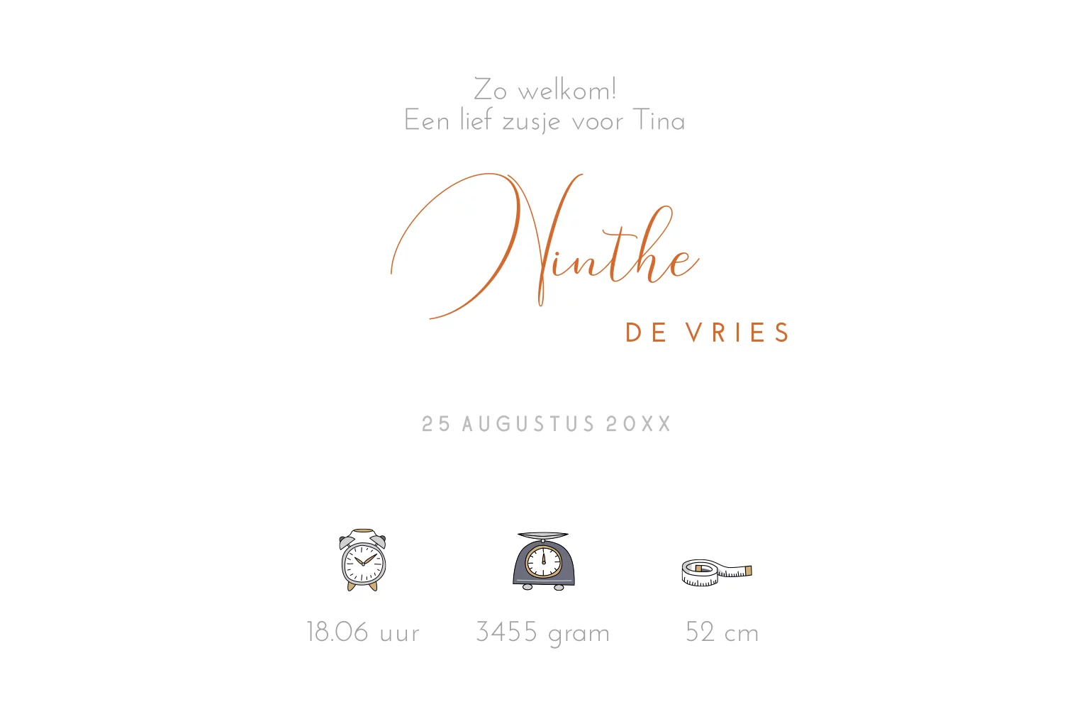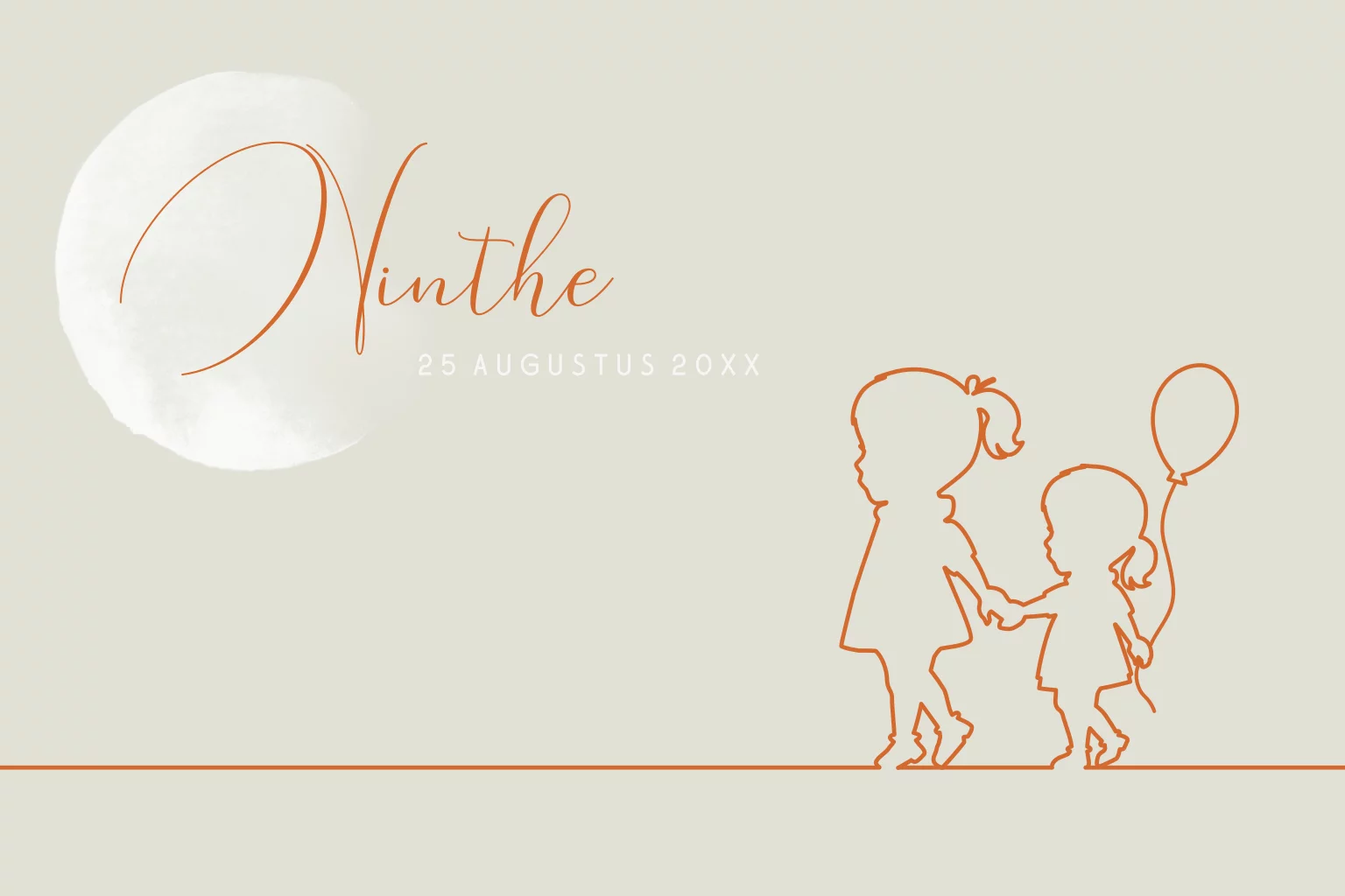 Hippe liggende geboortekaart met silhouetten in lijnen van broertje en zusje op een lijn, horizon. Deze leuke kaart kun je zelf bewerken, kies een andere afbeelding die past bij je gezinssituatie of vraag ons om hulp
