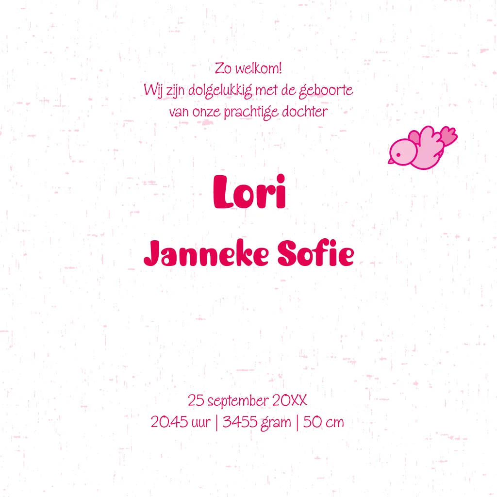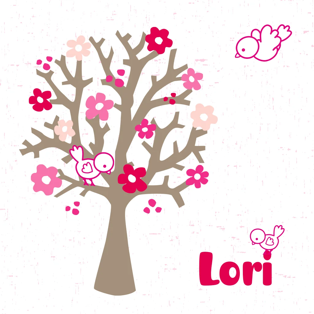 Vrolijke geboortekaart Lori met boom bloemetjes en lieve vogeltjes