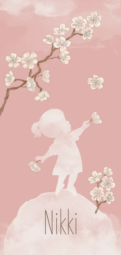 Geboortekaartje met ronde hoeken en silhouet van een meisje in waterverf en een takje met bloesem, jasmijn bloemetjes