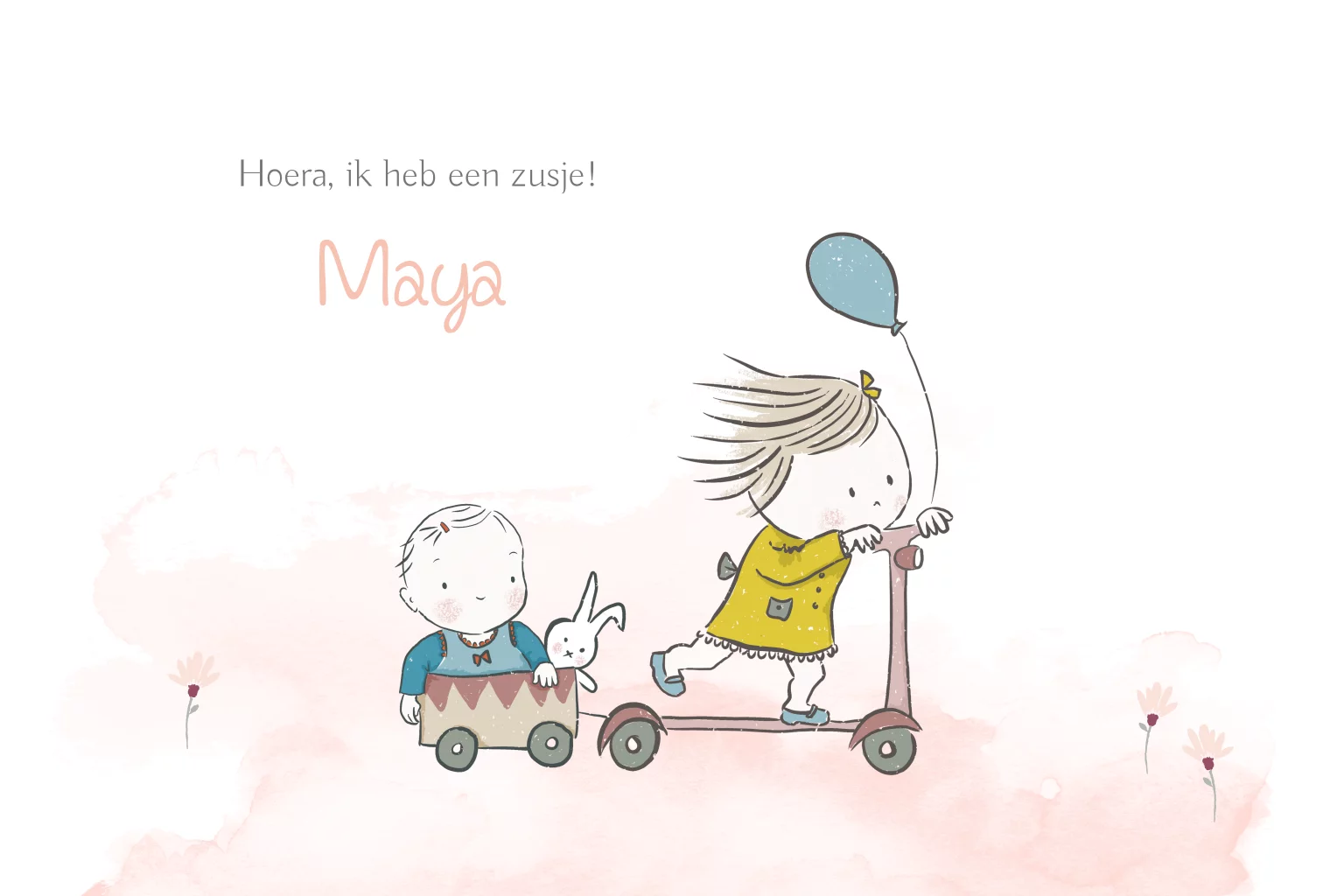 Vrolijk geboortekaartje met twee getekende zusjes op de step in een omgeving van waterverf en bloemetjes.