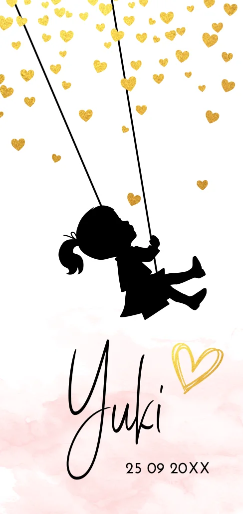 Staand geboortekaartje met confetti van goudkleurige hartjes, waterverf en silhouet van meisje op een schommel. Deze kaart kun je zelf eenvoudig aanpassen