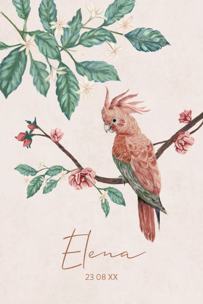 Een hele mooie geboortekaart met een prachtige getekende papegaai op een takje met bloemen en bladeren. Deze kaart kun je naar eigen idee bewerken door bijvoorbeeld de afbeeldingen te vervangen en het lettertype aan te passen