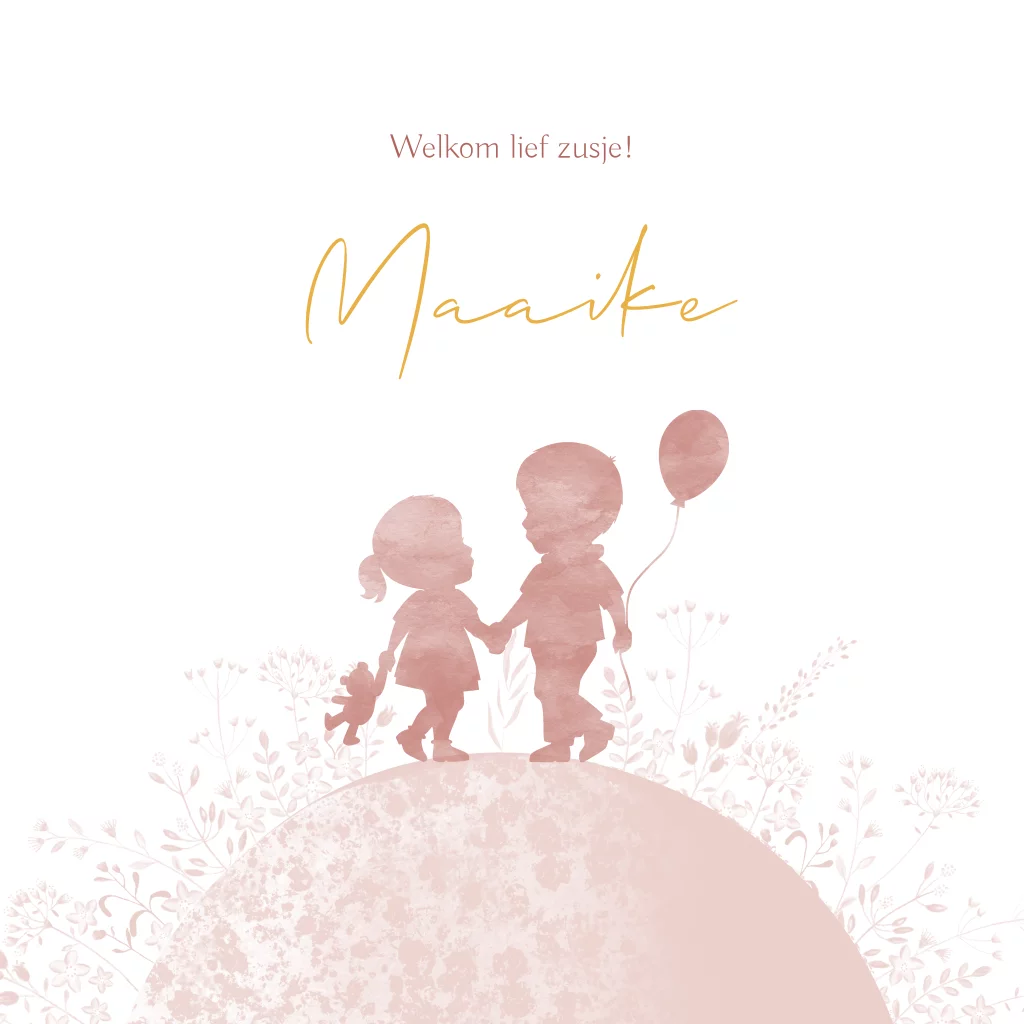 Lief geboortekaartje met waterverf silhouet en illustraties takjes met bloemen in aquarel. Dit babykaartje kun je zelf andere kleuren geven of aanpassen naar jouw eigen gezinssituatie met de afbeeldingen in de beeldbank Dus dan ook voor een eerste, derde, vierde of vijfde kindje etc.