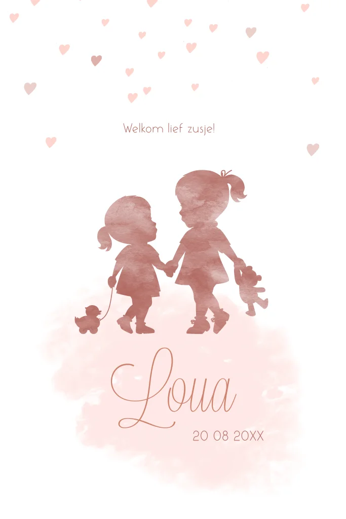 Hippe geboortekaart voor twee zusjes met meisjes hand in hand met hartjes confetti. De kleuren zijn in terra en roest maar kun je eenvoudig zelf aanpassen evenals de afbeeldingen, ook voor broertjes en broertjes en zusjes. Dit kaartje heeft afgeronde hoeken.