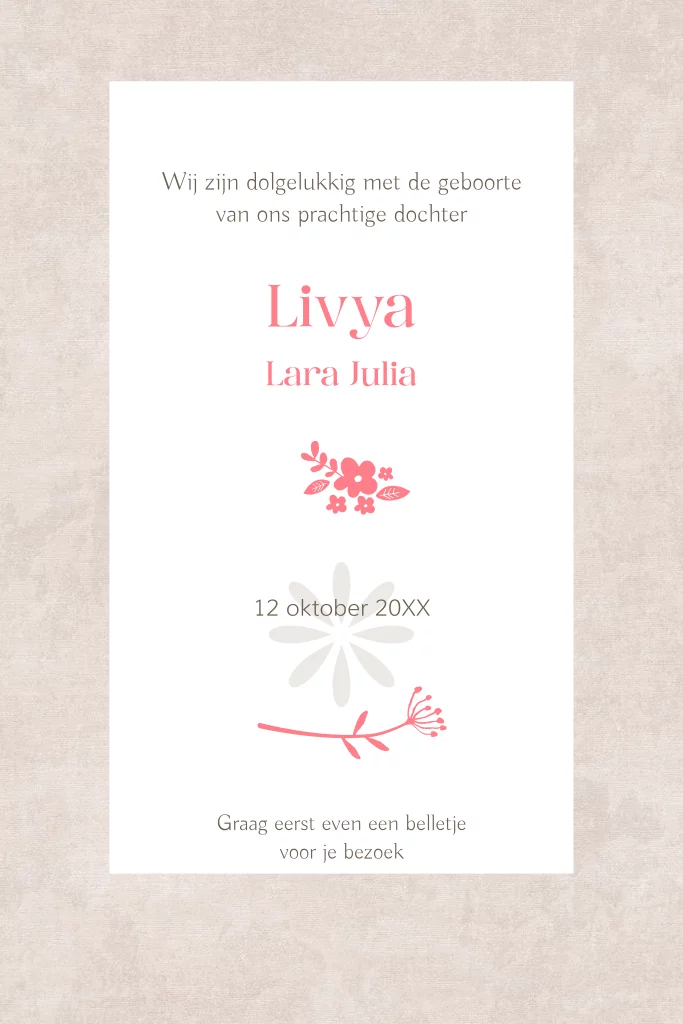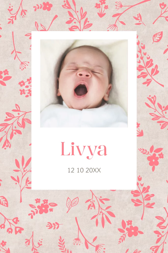 Lief geboortekaartje een kader op een zacht roze achtergrond en een eigen foto. Rechthoekige staande dubbele fotokaart met een hip bloemen dessin wat je zelf een andere kleur kunt geven.