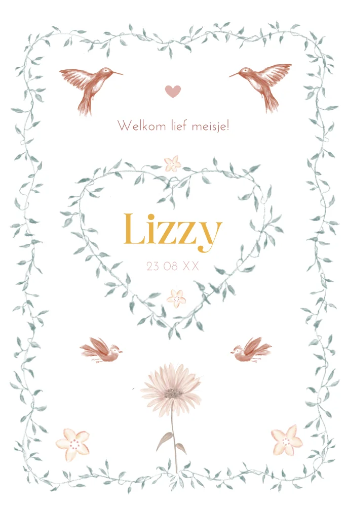 Lief geboortekaartje met waterverf blaadjes kader, vogeltjes en veldbloemen voor een meisje. Verander zelf eenvoudig de kleuren of pas de afbeeldingen aan uit de beeldbank en maak dit kaartje met ronde hoeken helemaal eigen.