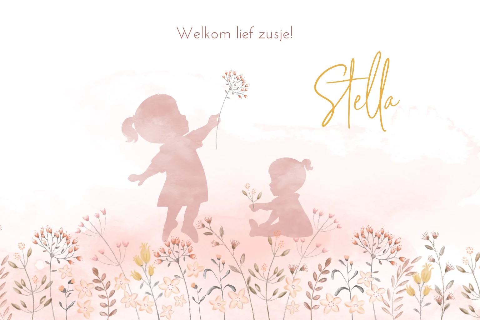 Lief geboortekaartje voor een tweede kindje. Welkom lief zusje. Verander zelf eenvoudig de kleuren of pas de afbeelding aan voor een ouder broertje