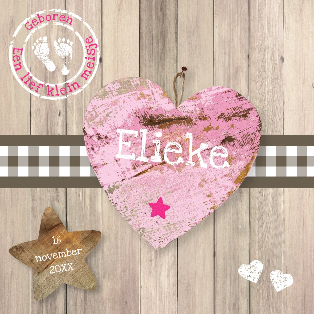 Trendy, stoer geboortekaartje met steigerhout hart aan touwtje, ruitje en hippe stempels voor jongen. Op de voorkant een roze geverfd houten hart met de naam.