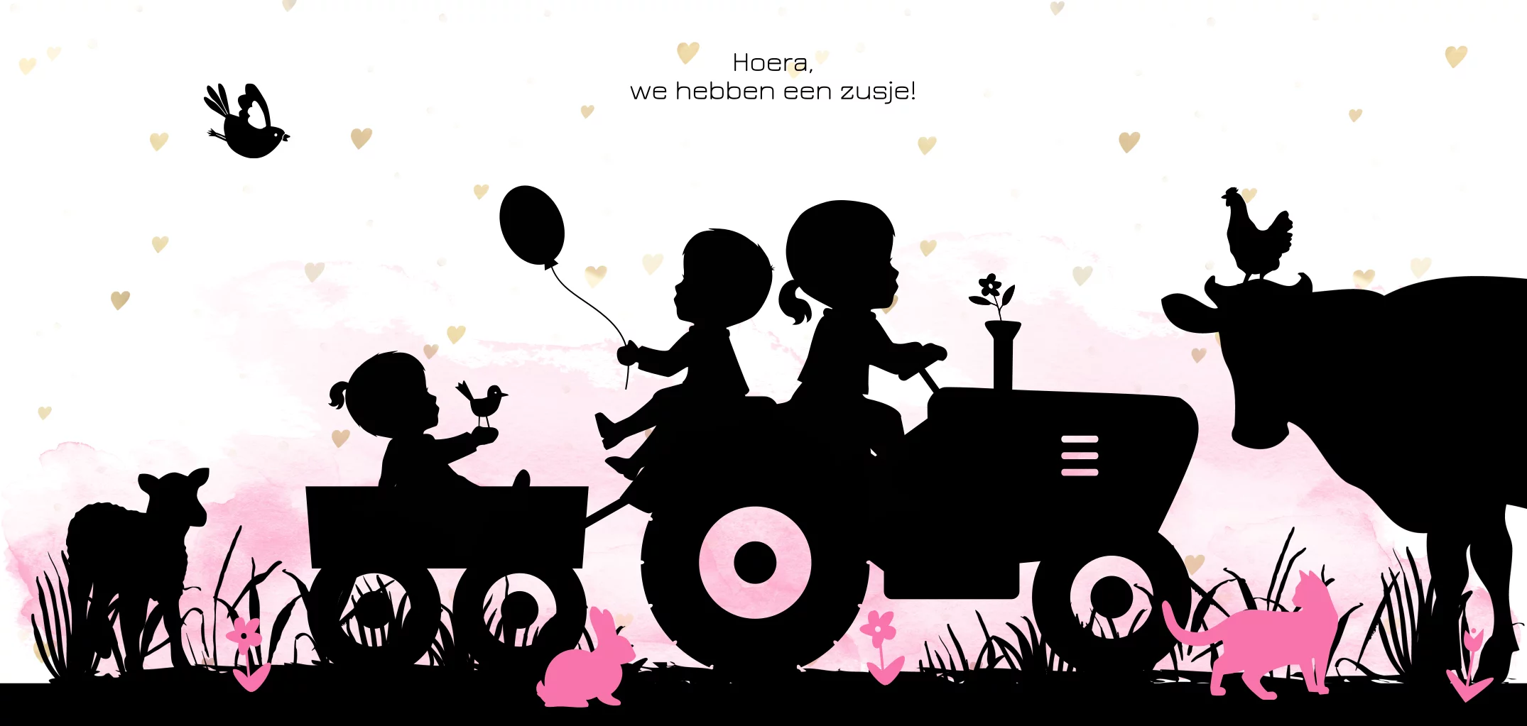 Leuke liggende geboortekaart voor een derde kindje met drie kinderen op een tractor en verschillende silhouetten van dieren als een koe, een lammetje, een kip, een haan een poesje en een konijn