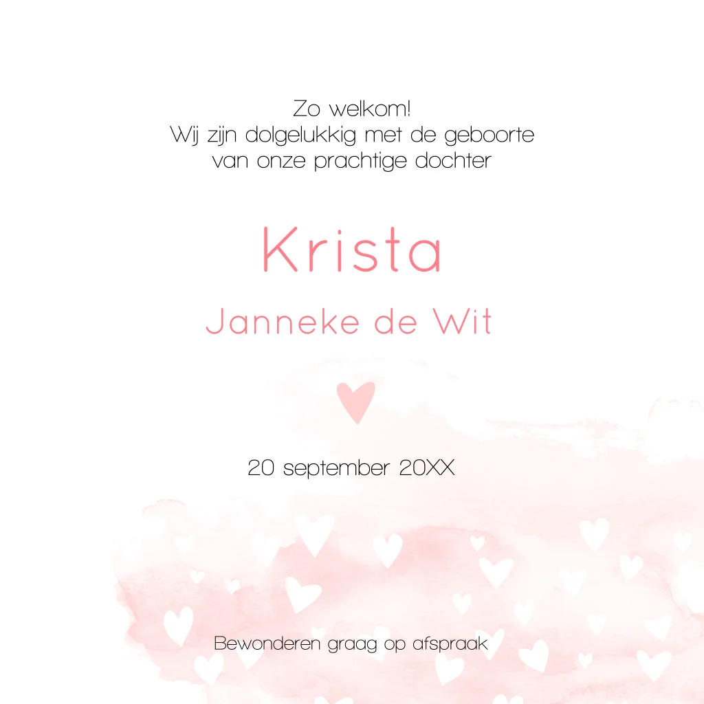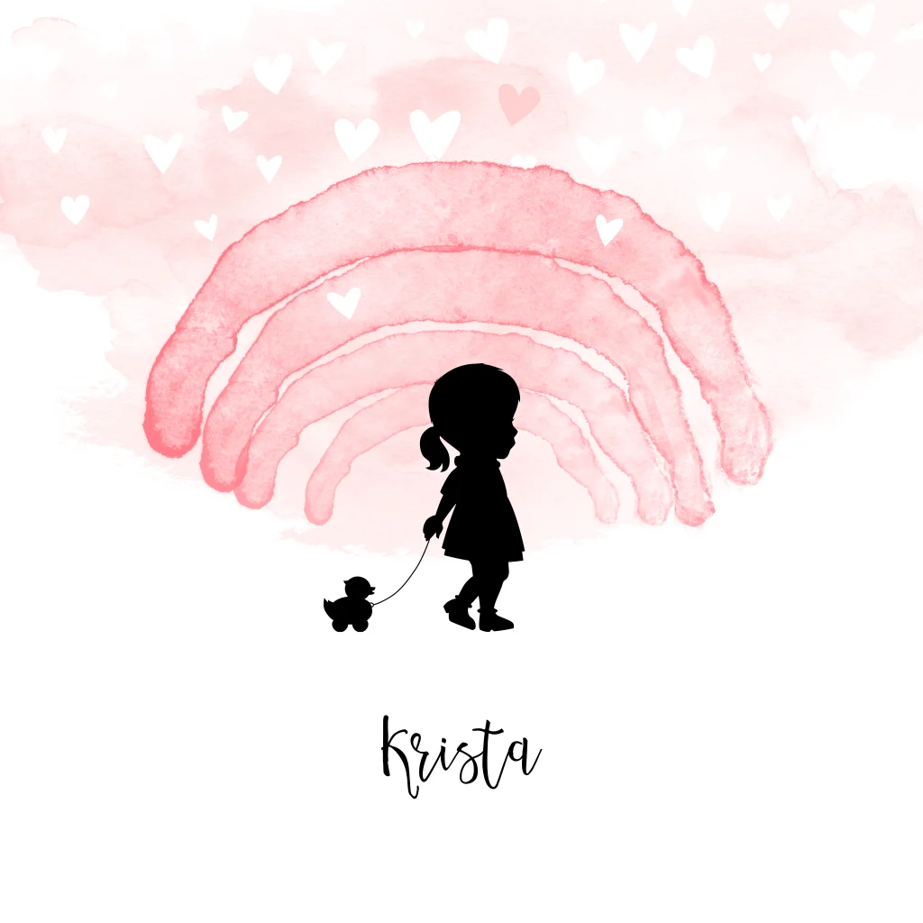 Lief geboortekaartje met silhouet van meisje met waterverf regenboog en hartjes.
