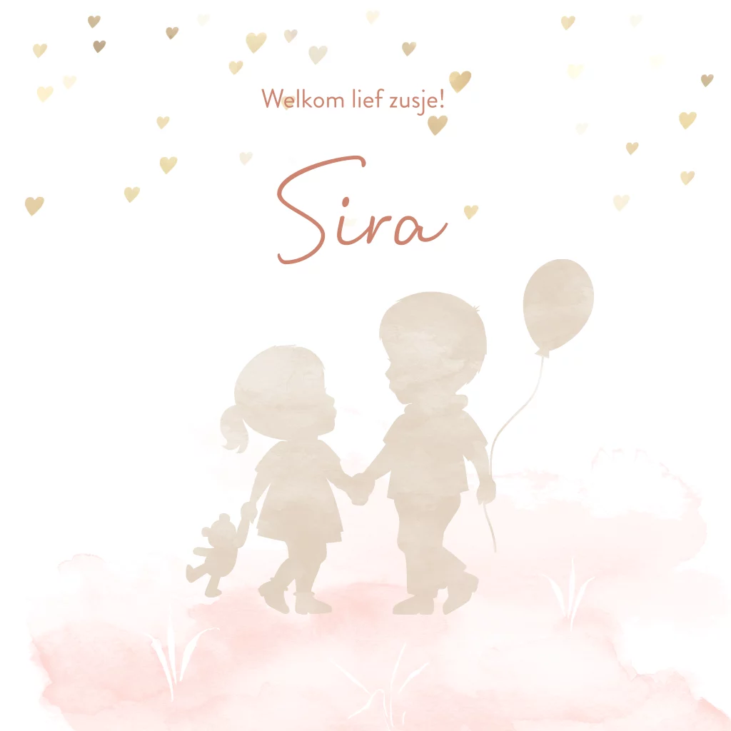 Schattig geboortekaartje met watercolor silhouetten meisje met staartje en haar grote broer met dwarrelende goudkleurige hartjes.