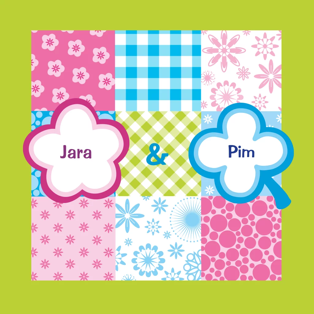 Trendy geboortekaart met klavertjes en bloem voor tweeling