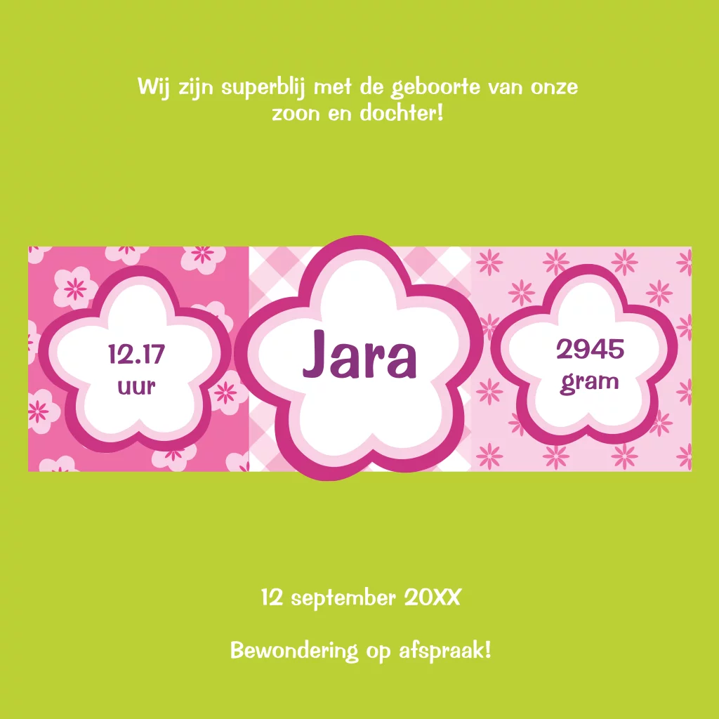 Dit stoere geboortekaartje in lime met klavertje vier van geluk en bloemetjes is voor een tweeling bedoeld. Leuk en vrolijk tweelingkaartje voor jongen en meisje