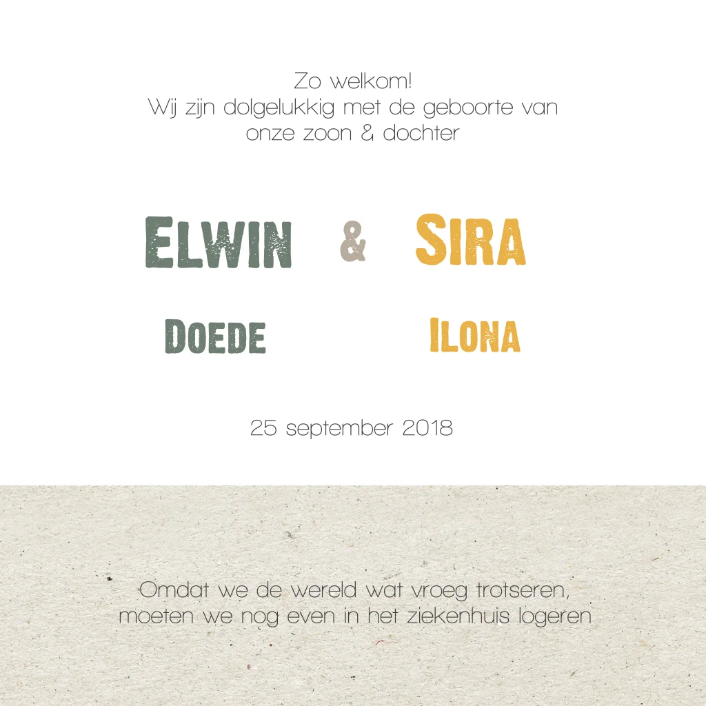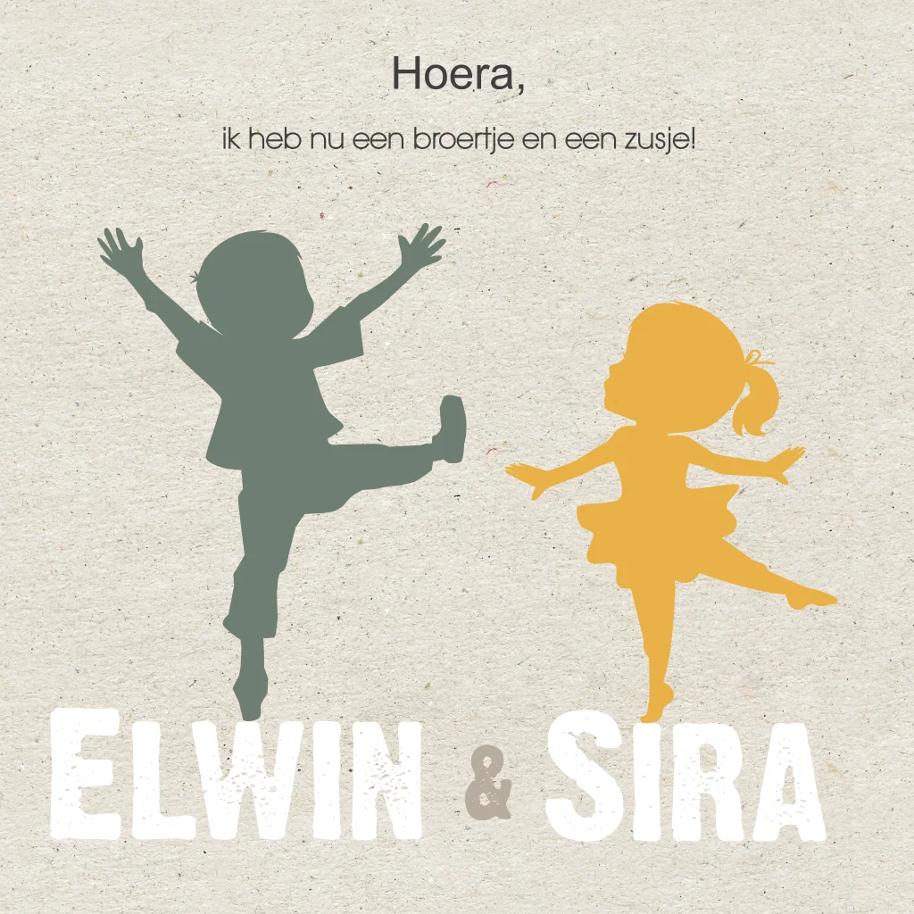 Lief en stijlvol geboortekaartje voor tweeling met silhouet van broertje & zusje en kraft papier op de achtergrond.