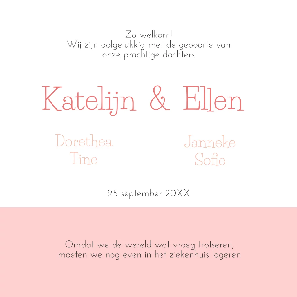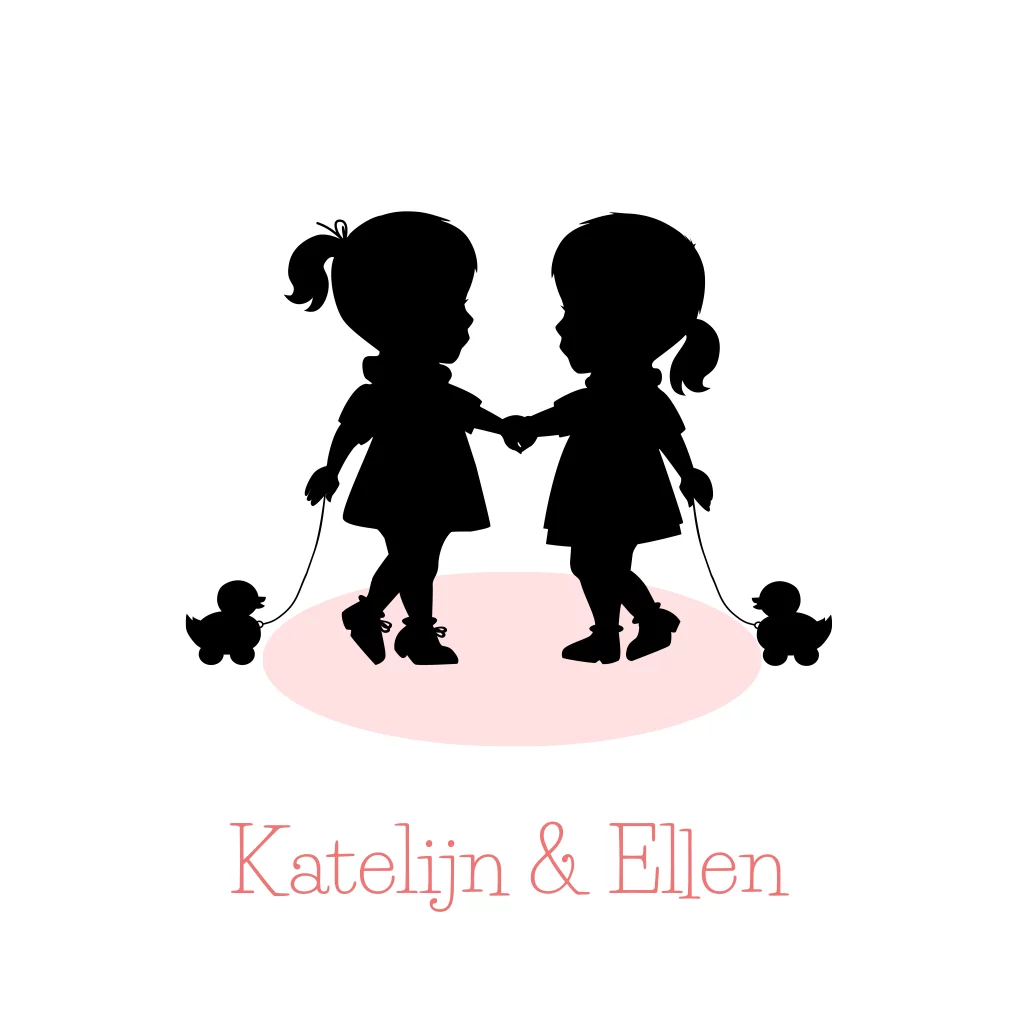 Lief en stijlvol geboortekaartje voor tweeling met silhouet meisjes hand in hand.