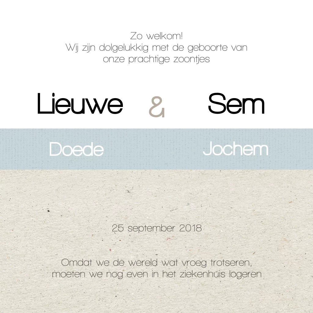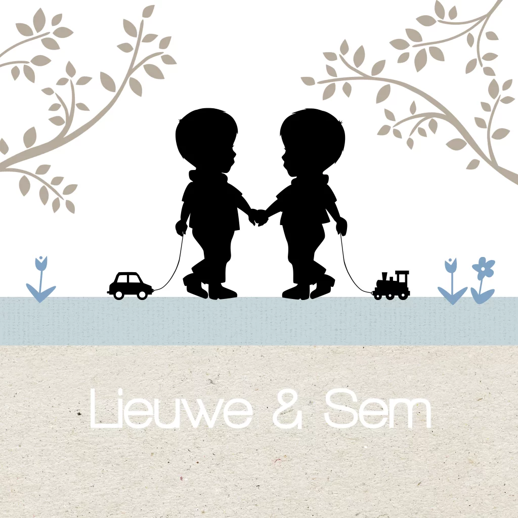 Lief en stijlvol geboortekaartje voor tweeling met silhouet van broertjes hand in hand met kraft papier op de achtergrond.