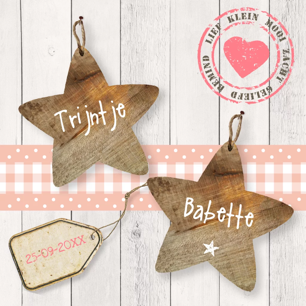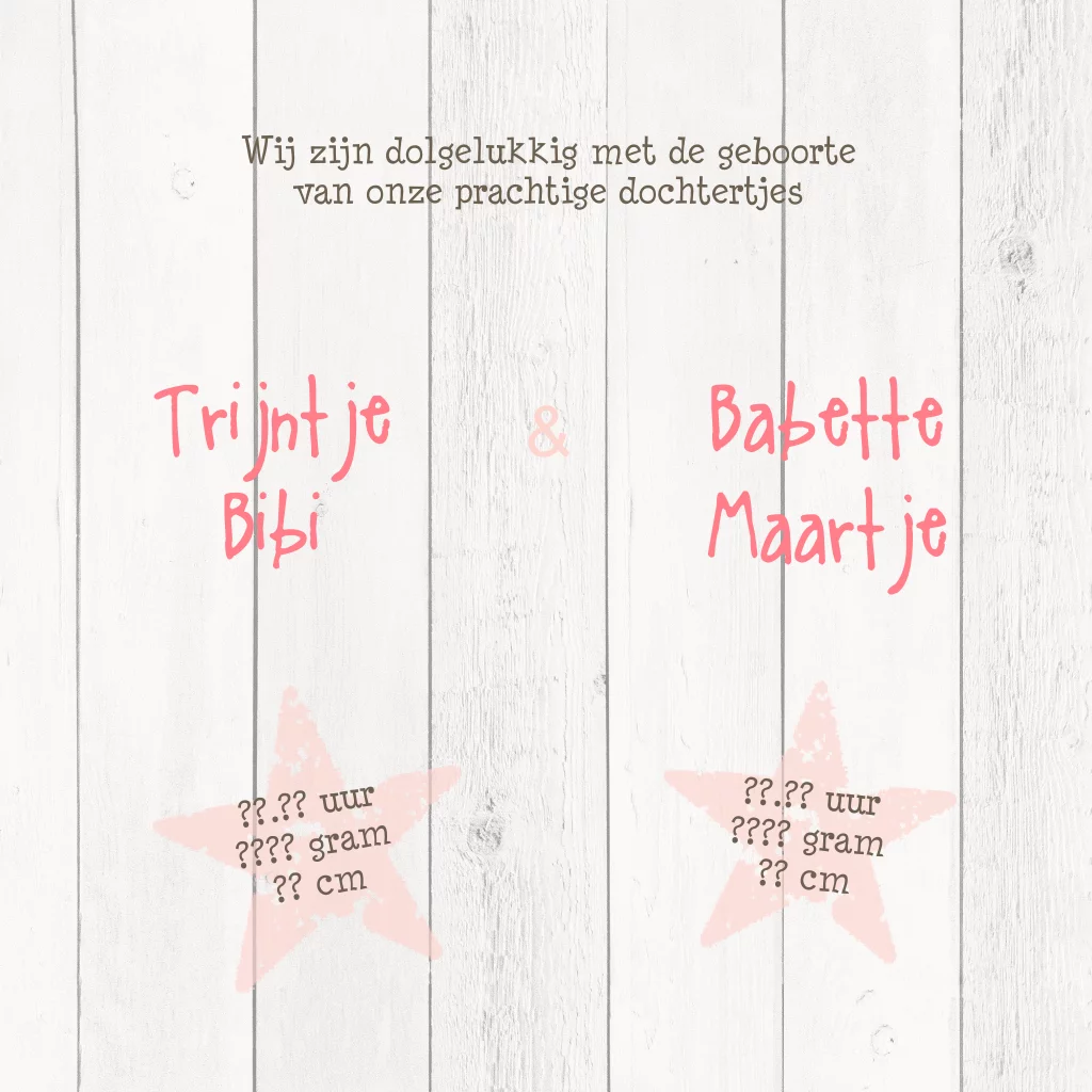 Stoere, trendy geboortekaartjes met houten sterren en hippe stempels en sterren op roze geverfd steigerhout voor tweeling. Baby voetjes op de achterkant. Populaire tweelingkaart met hout en ruitjes om zelf te maken. Trendy tweelingenkaartjes voor hippe meisjes.