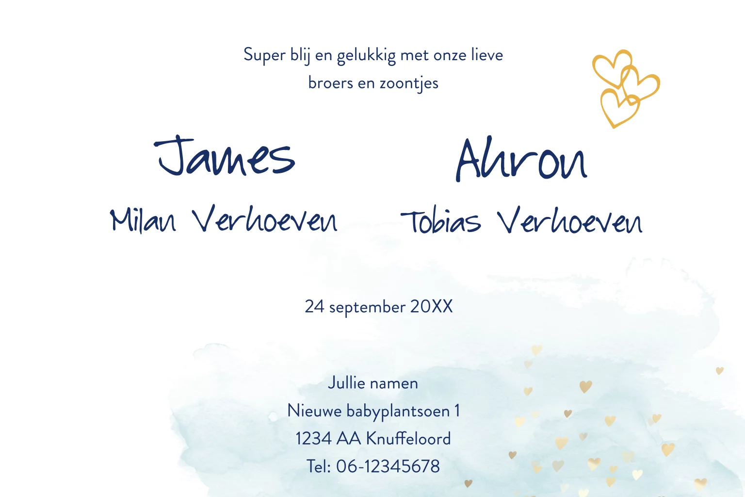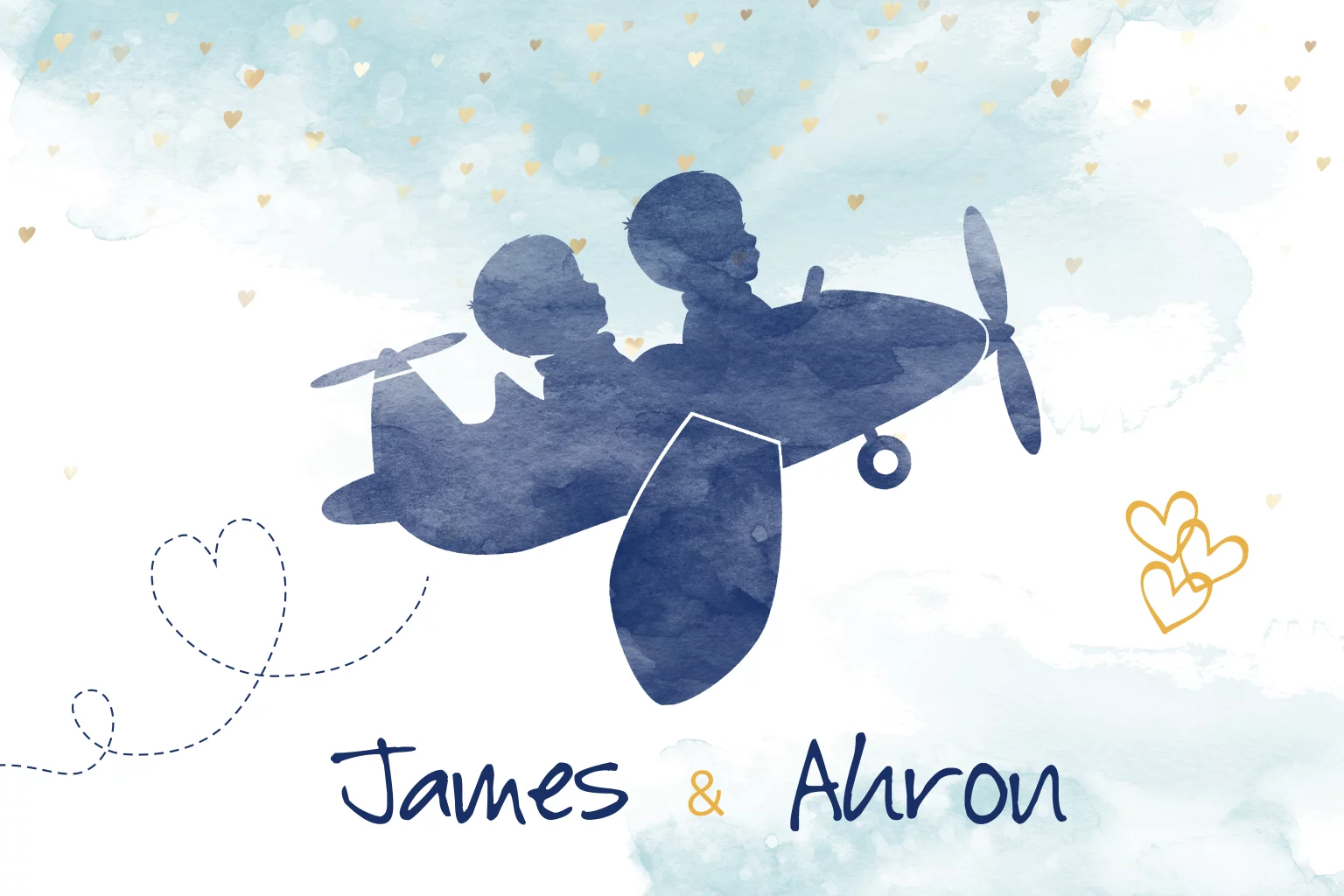 Silhouet tweelingkaart met twee jongetjes in een vliegtuig met waterverf en confetti van hartjes. Pas deze kaart zelf aan als je een jongen en een meisje verwacht met de afbeeldingen uit onze beeldbank.
