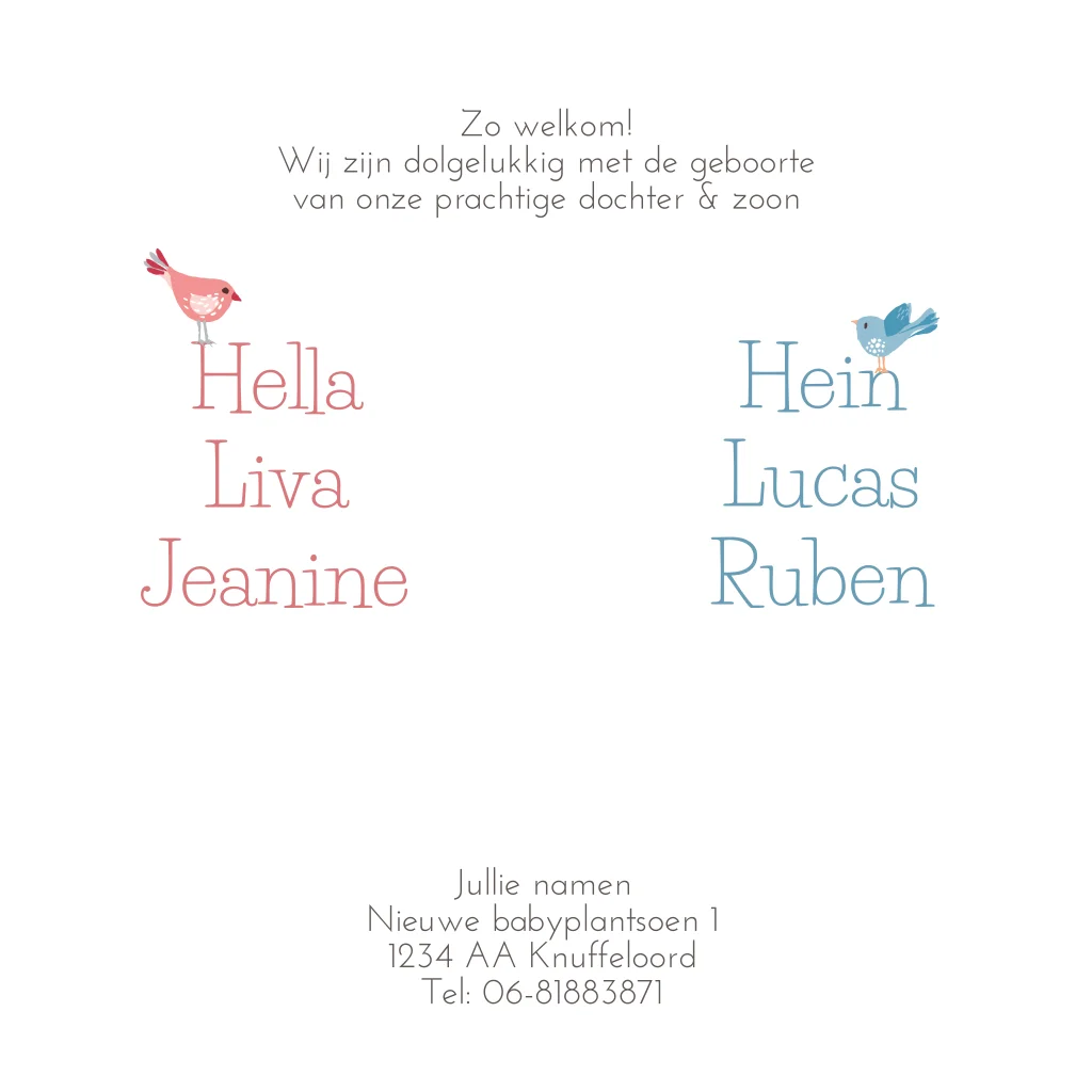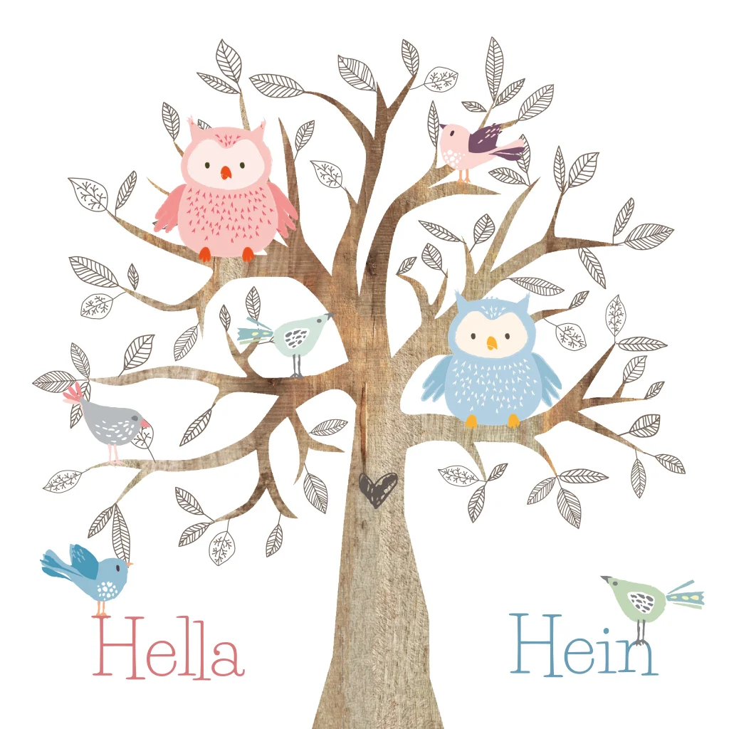vrolijke geboortekaart voor tweeling met boom uiltjes en vogeltjes