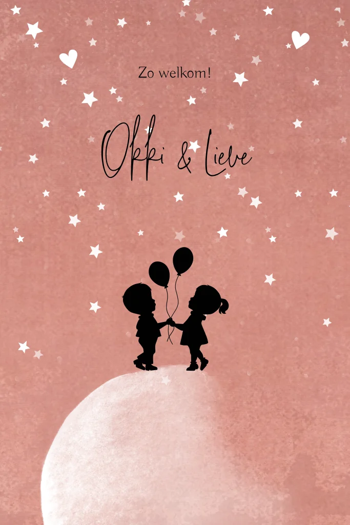 Een toffe staande tweelingkaart met een velvet-look achtergrond, silhouetten, wereldbol in aquarel en sterretjes. Deze kaart kun je bewerken voor twee jongens of twee meisjes door de afbeelding te vervangen voor een ander silhouet uit onze beeldbank.