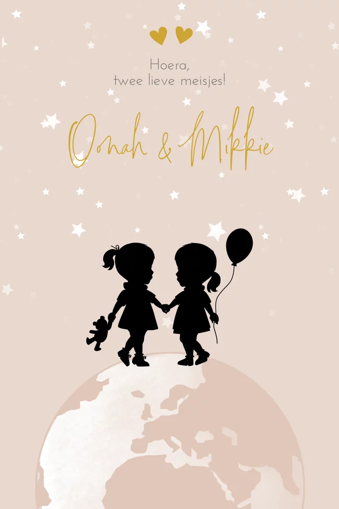 Een hele toffe geboortekaart voor twee meisjes met silhouetten, een wereldbol en sterretjes. Deze tweelingkaart kun je eenvoudig zelf bewerken en aanpassen als je bijvoorbeeld twee jongens of een meisje en een jongen krijgt of een kindje. Deze kaart kun je personaliseren naar jouw eigen gezinssituatie.