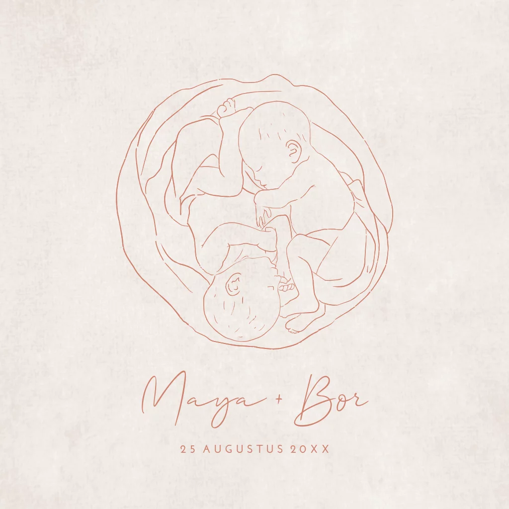 Mooie tweeling geboortekaart met lijntekening van twee baby's slapend bij elkaar. Pas eenvoudig zelf de kleuren aan van deze stijlvolle unisex tweelingkaart