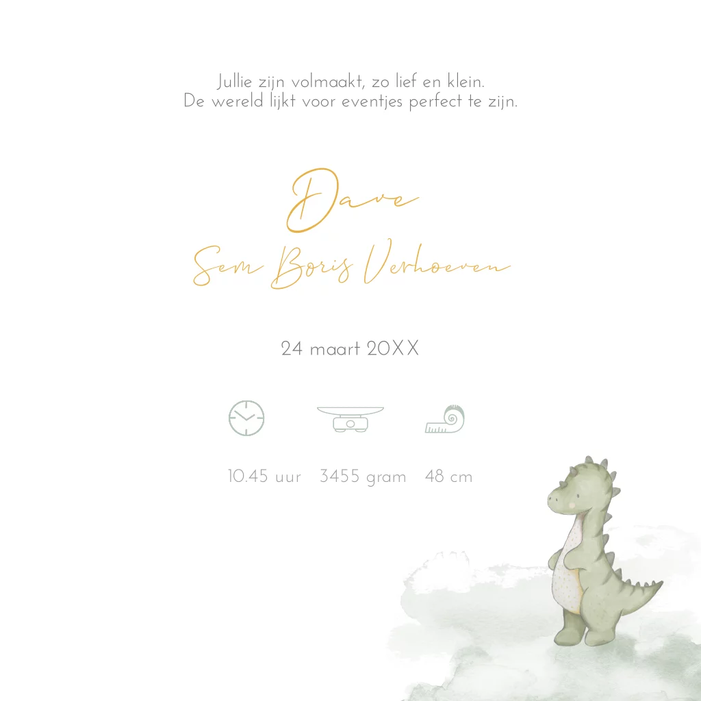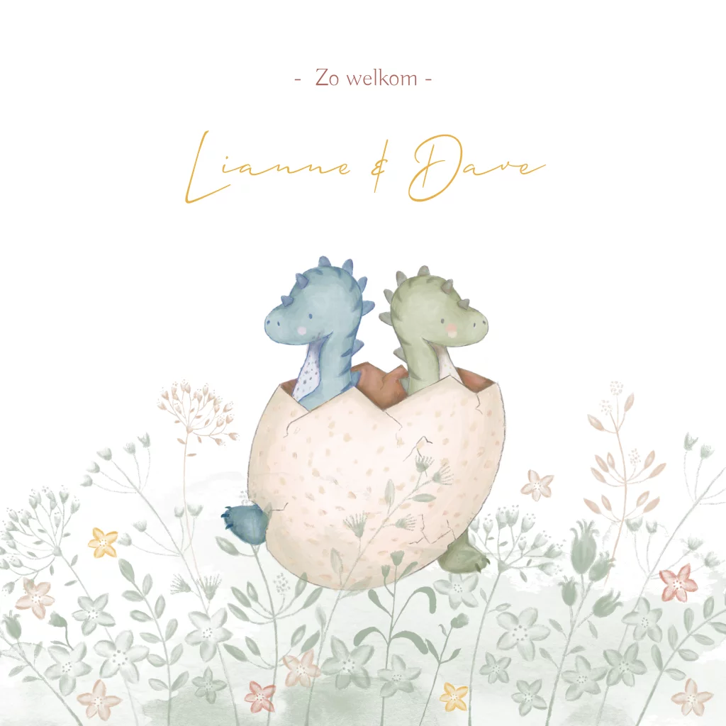 Een schattig geboortekaartje voor een tweeling met een geschilderde illustratie van twee dino's die uit hun eitje kruipen en een rand van kleine bloemetjes in bruine en gele tinten. Deze unisex tweelingkaart kun je aanpassen voor twee meisjes of twee jongens. Liever een ander formaat, neem je dan even contact met ons op?