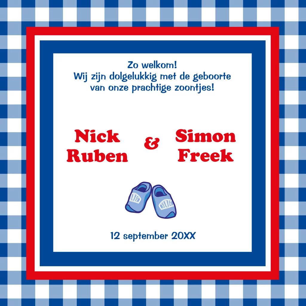 Vrolijke tweeling geboortekaart ruit met klompen tulp en molen