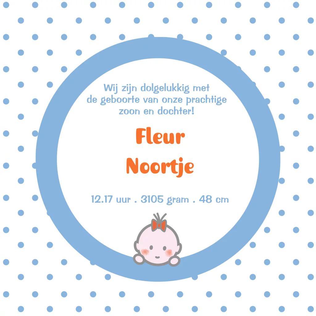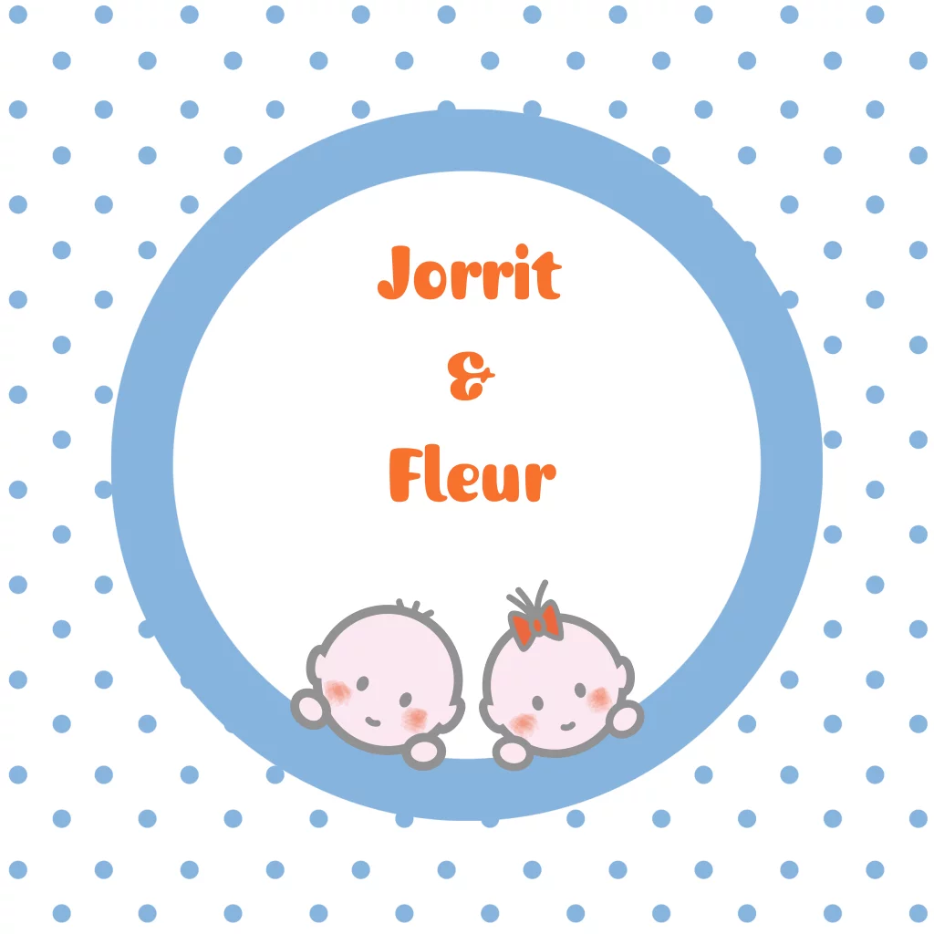 Vrolijke tweeling geboortekaart met stippen zelf maken en cartoon baby
