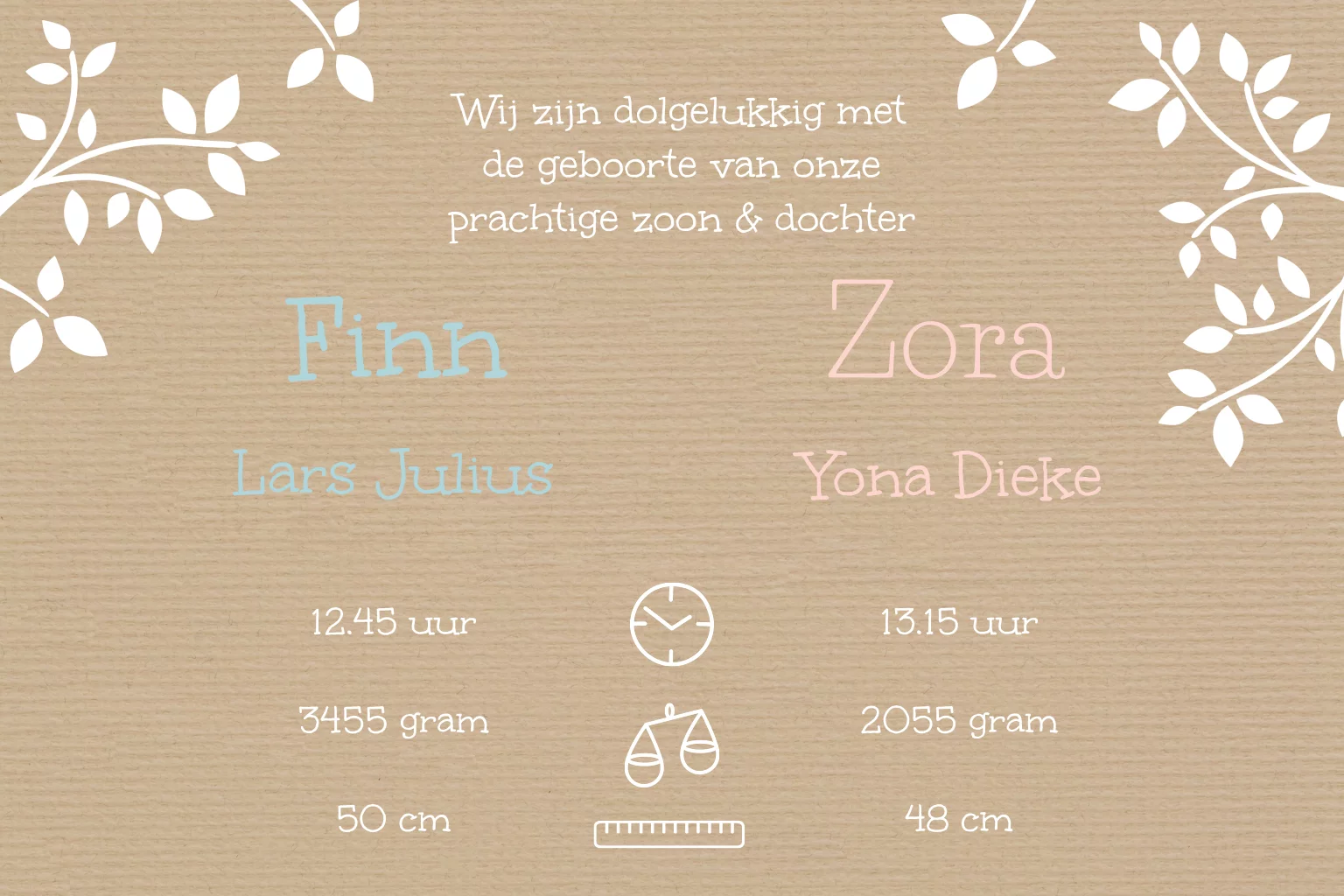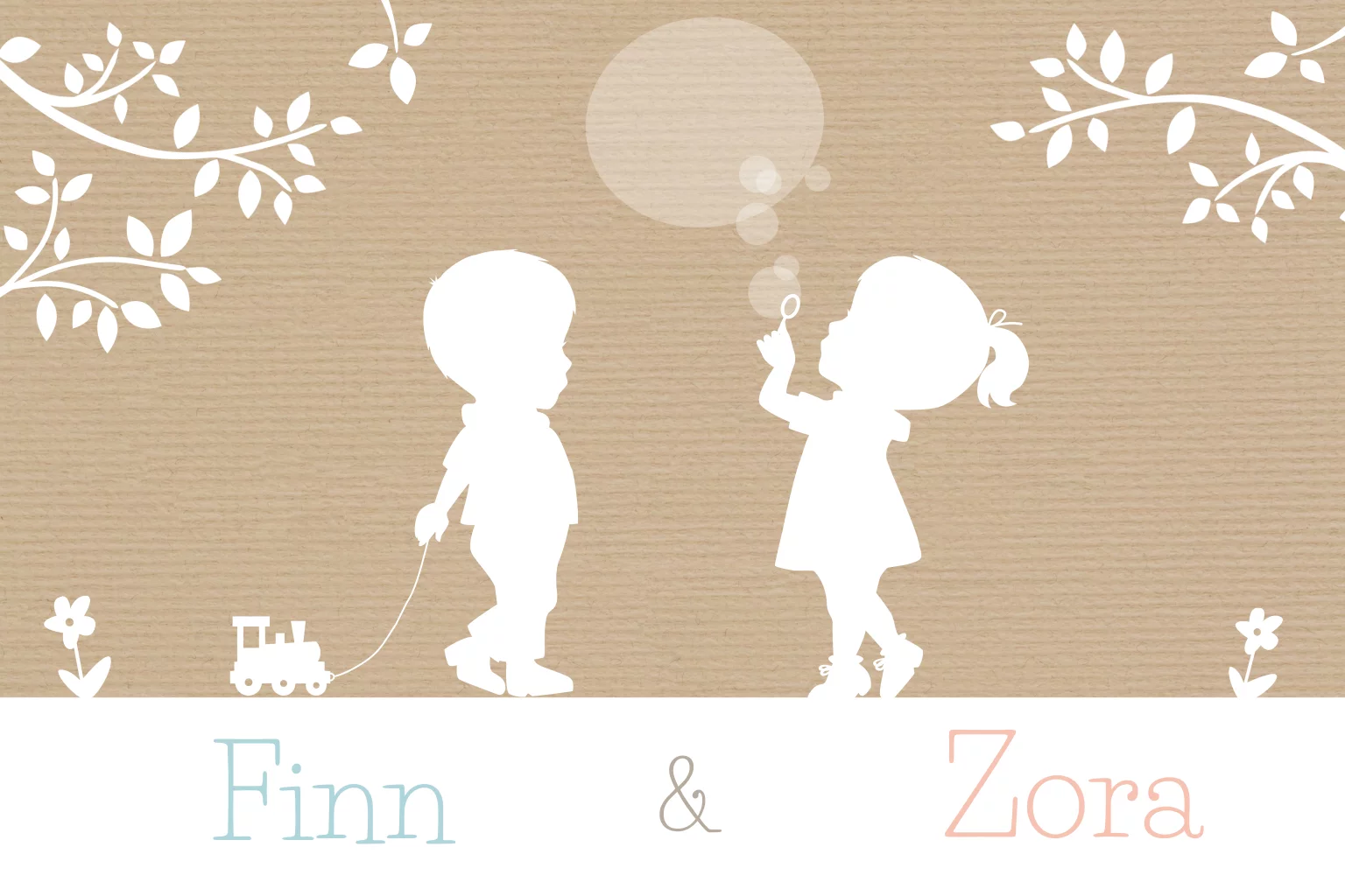 Trendy geboortekaartje met silhoutte van tweeling broer en zus