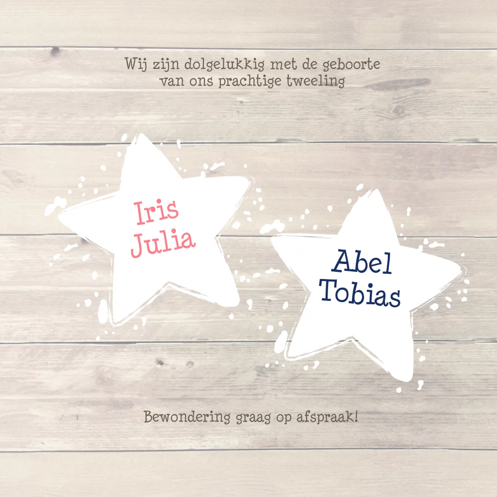 Geboortekaartje tweeling met sloophout en vrolijke hartjes en ster