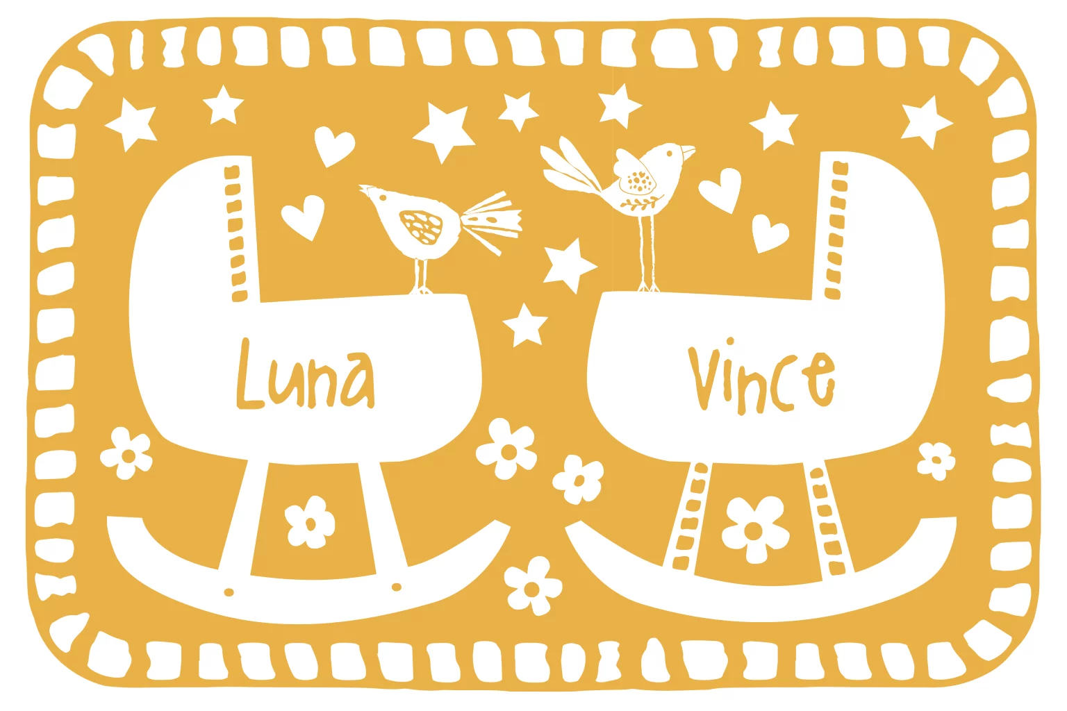 Hip tweelingkaartje met silhouet wiegjes en trendy vogeltjes
