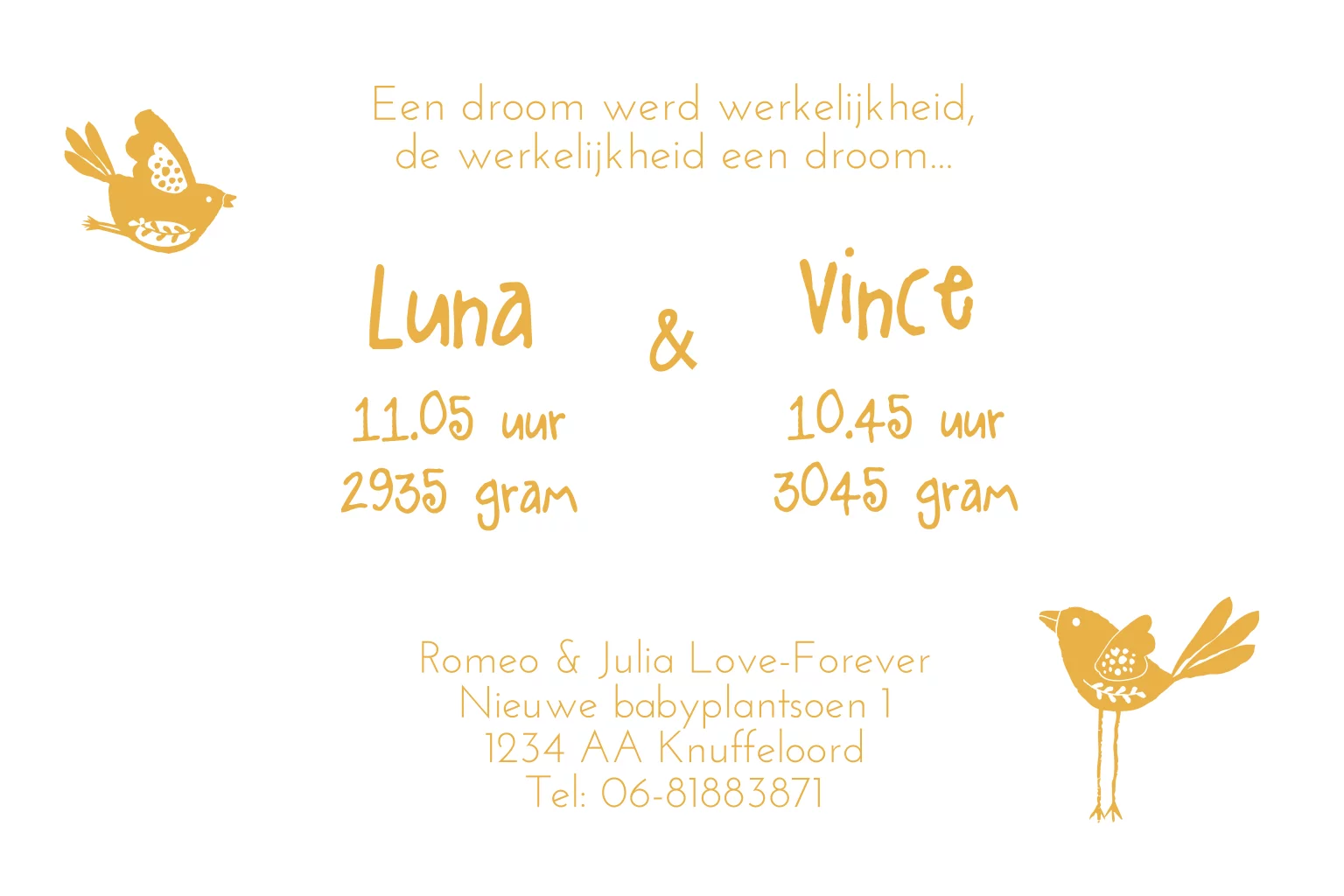 Lief tweelingkaartje met vogeltjes voor een liefste tweeling, jongen en meisje. Rechthoekige moderne liggende kaart